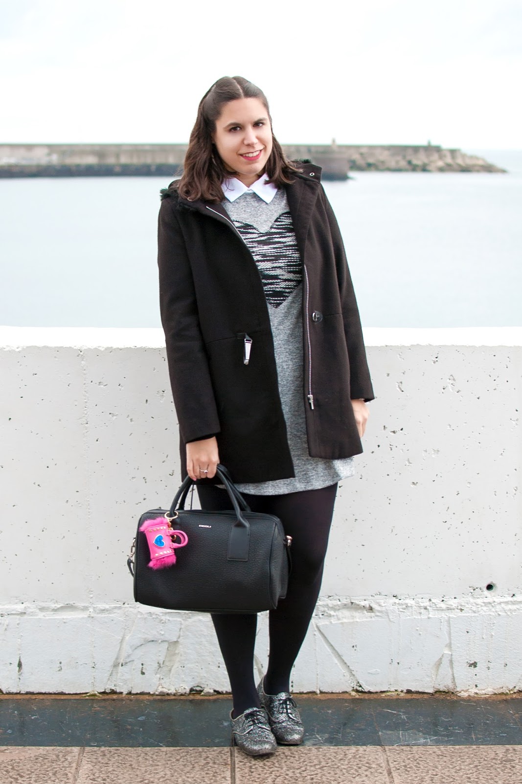 Qué monos los detalles que llevas tanto en el bolso como en el dedo. La verdad que en días grises son los colores que más nos apetecen. Yo adoro el paisaje que veo detrás tuyo, así como el look. EL gris es un color precioso y siempre lo tengo en invierno.