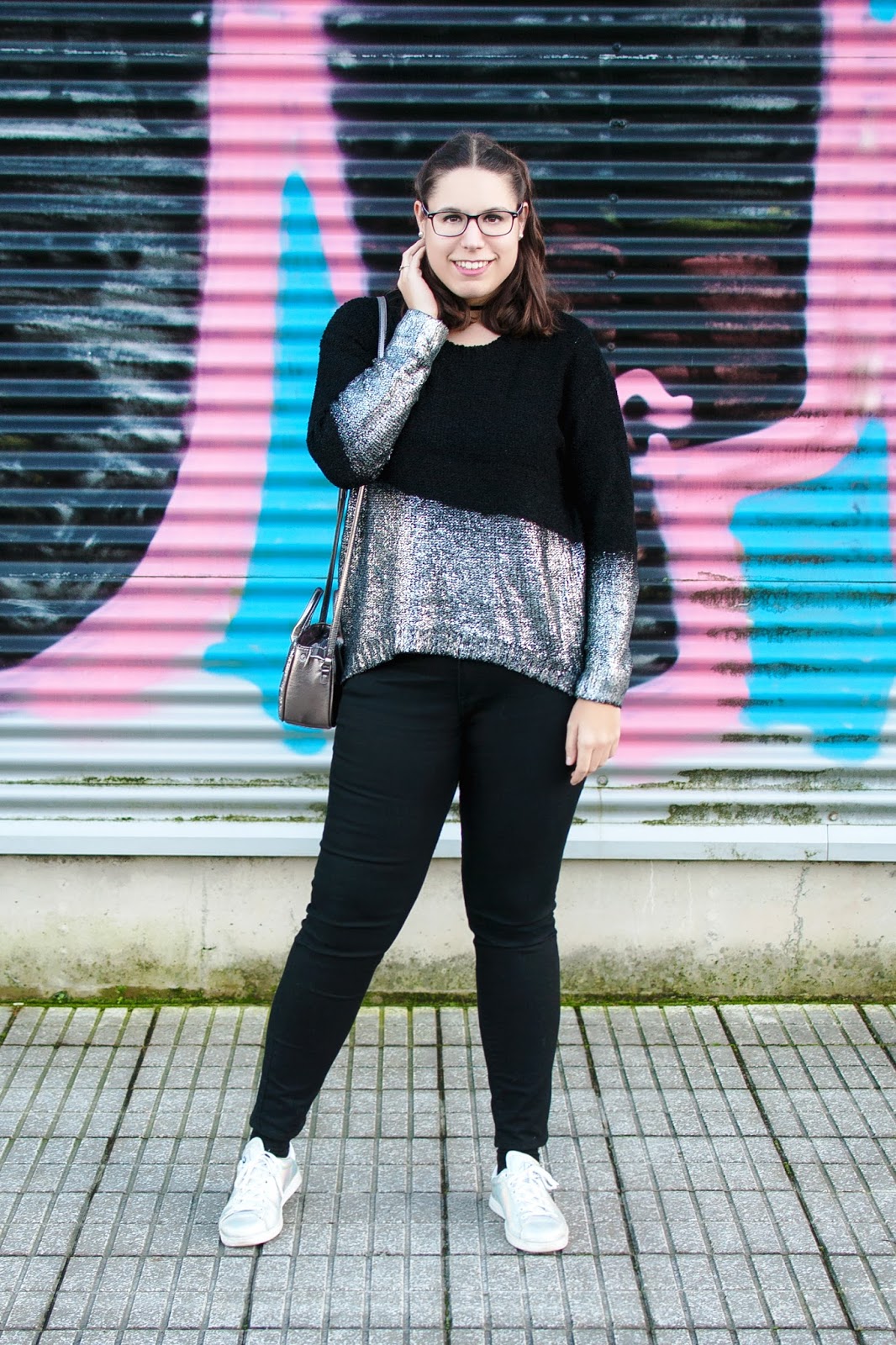 Me declaro oficialmente una amante empedernida de todo lo plateado y si brilla, mejor que mejor. Además tengo la suerte de que es una tendencia que está pisando muy fuerte en estos momentos. Combinado con negro puede ser la perfecta opción para un look de noche pero yo soy feliz usándolo en mi día a día. ¡Y es que con sneakers queda tan, tan bien! Os enseño el outfit que creé para una tarde de paseo por el centro, donde el protagonista es mi nuevo jersey de Zaful, muy calentito y original. Le quise dar un toque de color con mi reloj de conejito, que, por otra parte, creo que lo dulcifica un montón. Y vosotros, ¿también usáis prendas plateadas para diario? Espero que os guste y feliz semana ❤