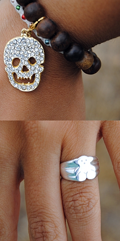 Pulseras mano derecha – puesto callejero (azul turquesa), Toscana (calavera) y Melyna