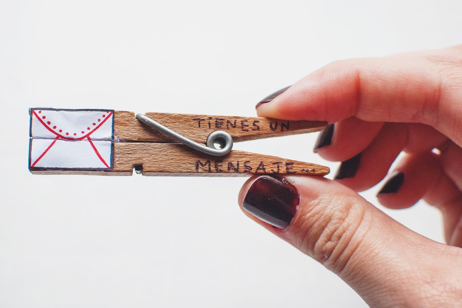 2. Pinza ‘Tienes un mensaje’: con una simple pinza de madera, puedes crear un pequeño regalito con mucho encanto y muy original. Dibuja un pequeño sobre en un folio y pégalo en la parte donde escribas el texto. Acuérdate de hacerle un corte por el medio para que la pinza se pueda abrir perfectamente. Escribe en otro papelito el mensaje que quieras transmitir, dóblalo en 3 partes (como si doblaras un folio para introducirlo en un sobre) y pégalo con mucho cuidado en el interior. ¡Se derretirán al abrirlo!