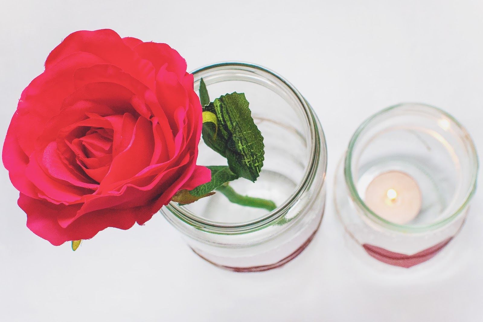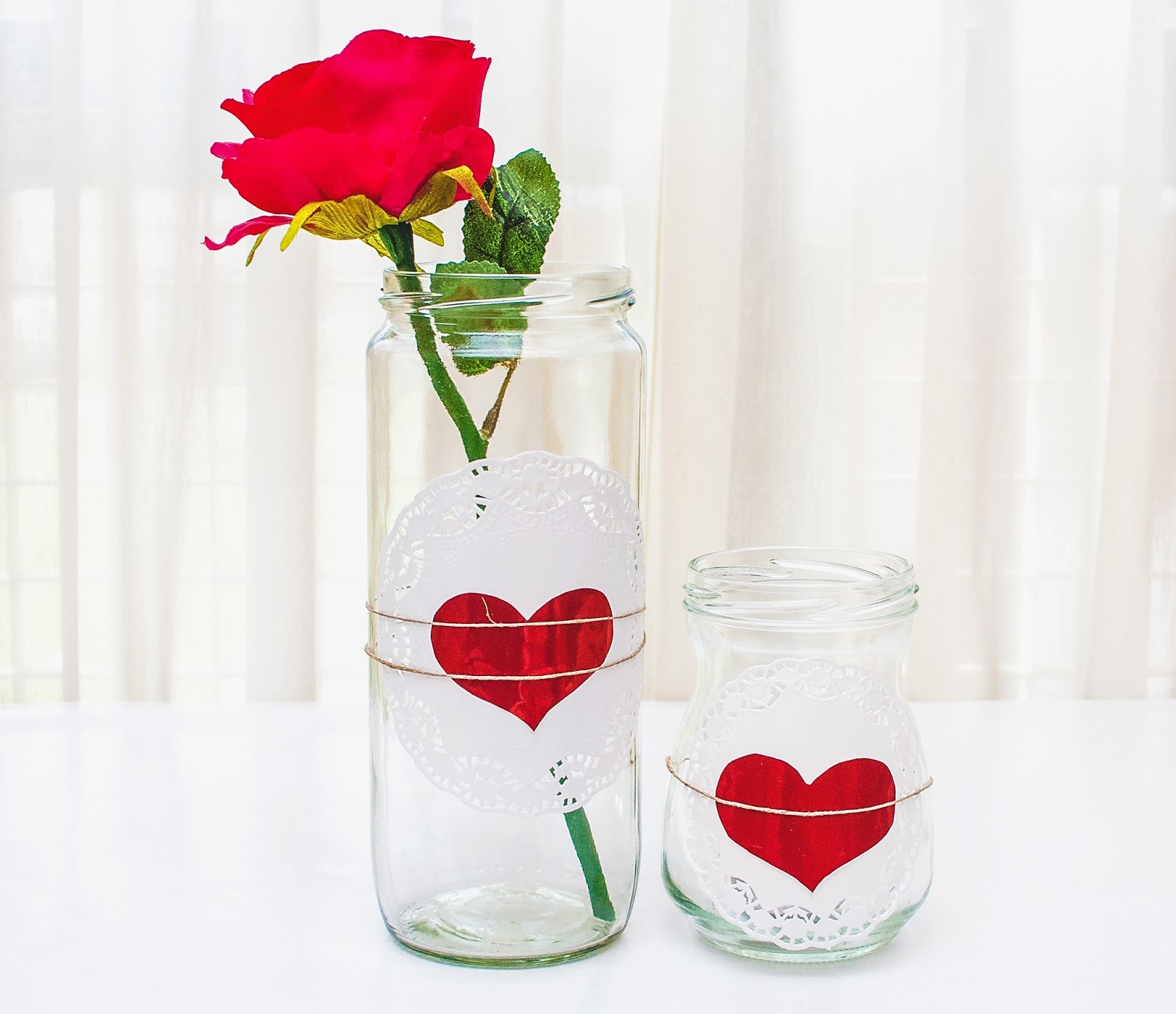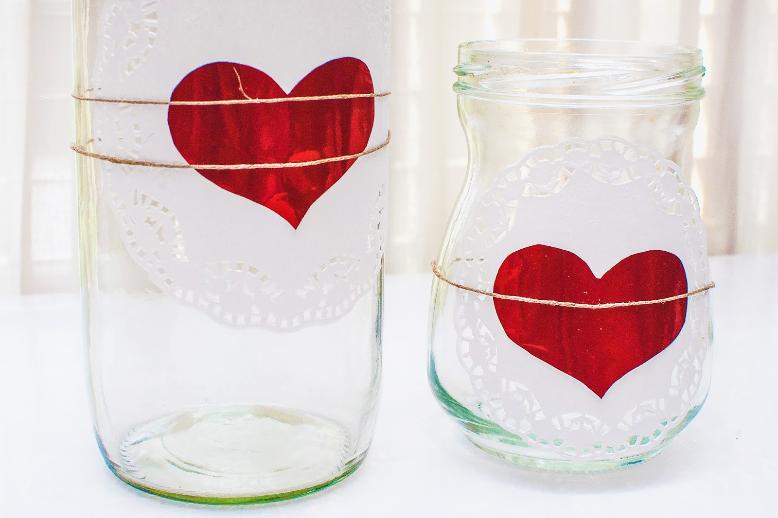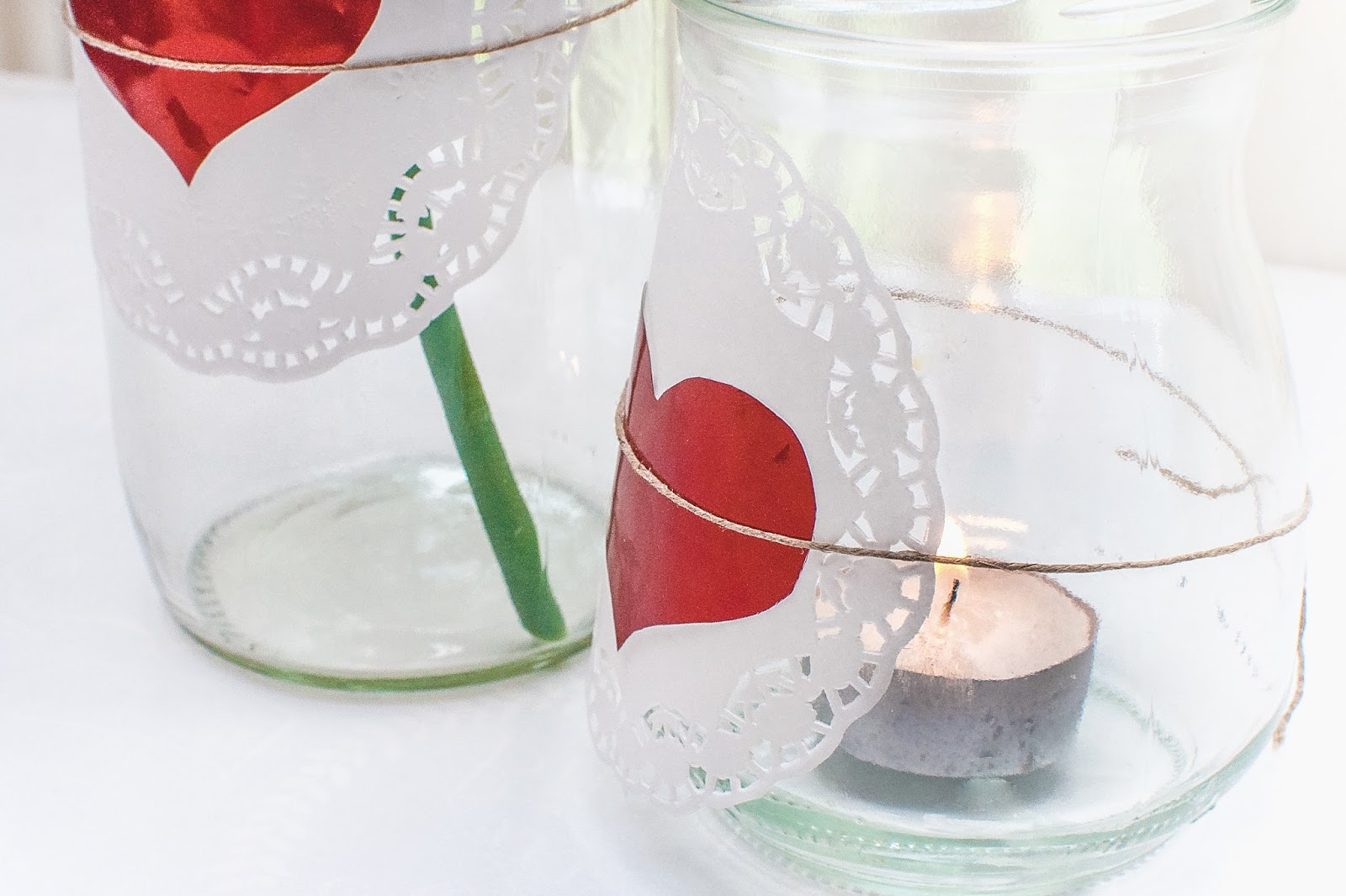 5. Tarros de cristal con mucho ❤: todos en nuestras casas tenemos algún que otro tarro de cristal guardado y abandonado. Da igual la forma, simplemente te tiene que parecer bonito y práctico. Coloca una blonda y un corazón rojo brillante, fíjalos con celo y añade un trocito de cordón a su alrededor. Una idea sencilla que puedes utilizar como florero para tus flores favoritas, como portavelas, para tener organizadas tus brochas de maquillaje o bolis y para un sinfín de cosas más.