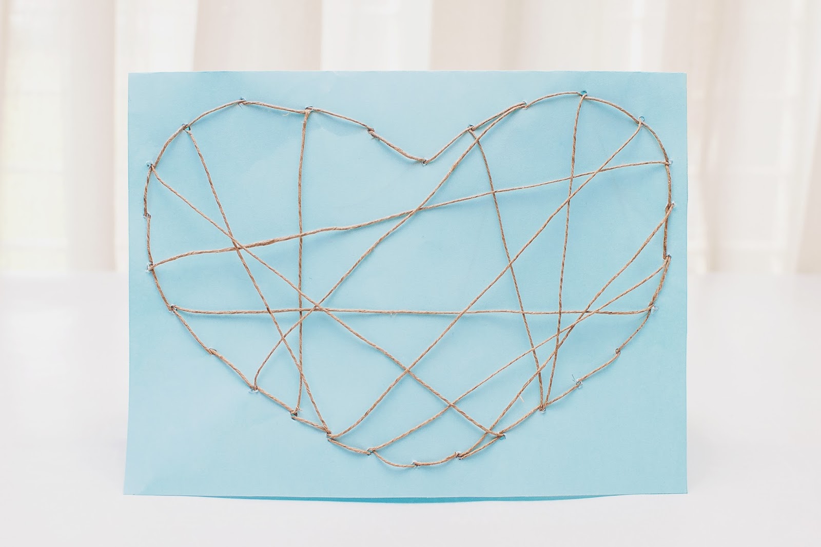 3. Postal corazón: en un folio haz agujeritos con un lápiz o punzón realizando la silueta de un corazón. Primero introduce el cordón por ellos para crear el contorno y luego une puntos de diferentes extremos para hacer el interior. ¡Experimenta y crea a tu gusto! Que vuele la imaginación ❤