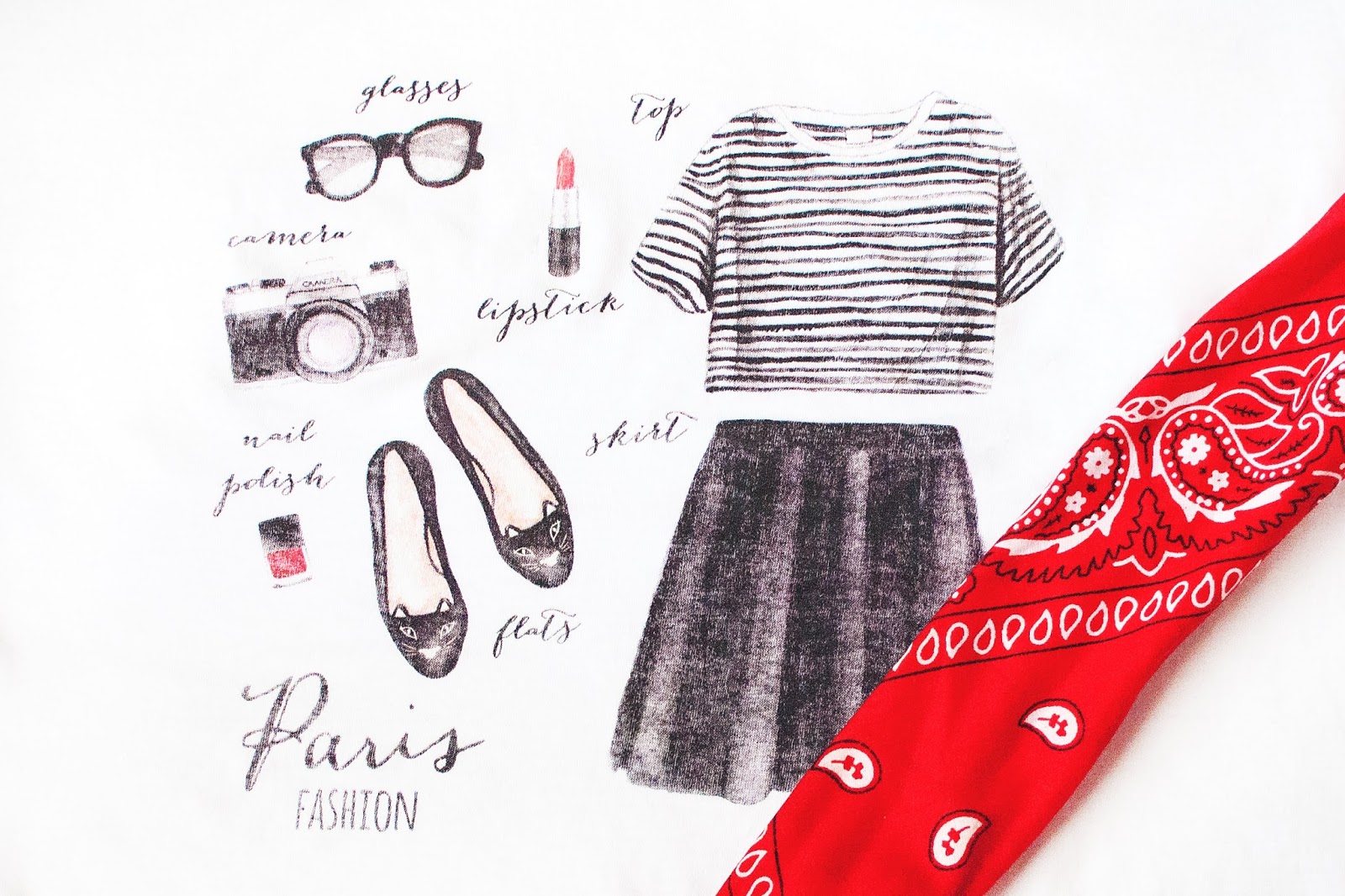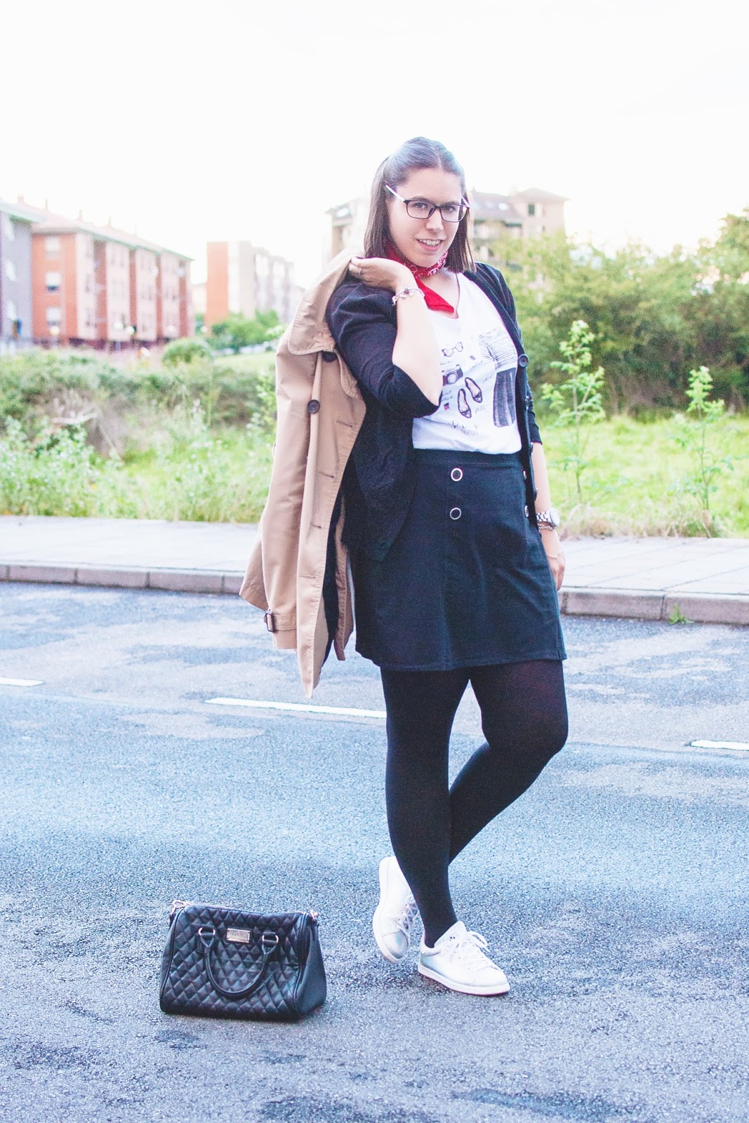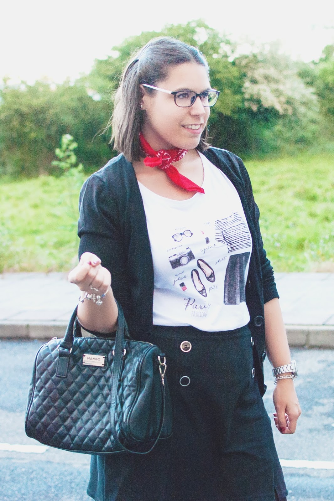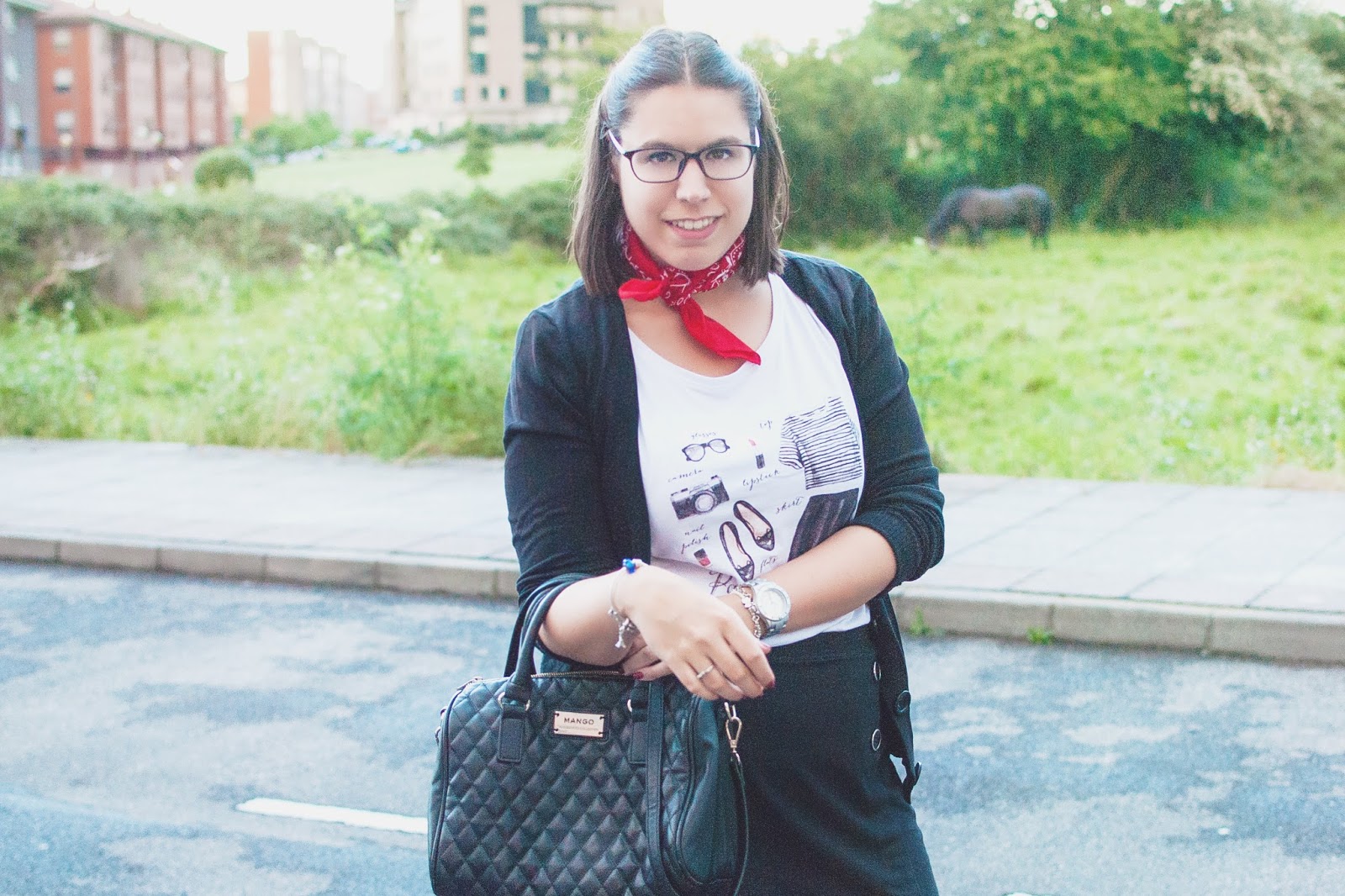 Por el norte, el buen tiempo todavía no ha aparecido y nos obliga muchas veces a utilizar prendas de abrigo y… ¡medias gorditas! ¿Cuándo les podremos decir adiós? De momento habrá que convivir un poquito más con ellas, aunque espero que a partir de mañana, que empieza junio (¿ya ha pasado medio año? ¡madre mía!), podamos ir poco a poco desprendiéndonos de algunas capas. Os enseño otro look con bandana al cuello, accesorio que se ha convertido en mi favorito esta temporada. ¡Aporta un toque que me chifla! Y mi camiseta, ¡ay mi camiseta! Desde que llegó a mi armario, ha conquistado totalmente mi ❤ ¡No puede ser más bonita y parisina! Adoro este tipo de ilustraciones, sencillitas pero ideales. Espero que os guste 🙂