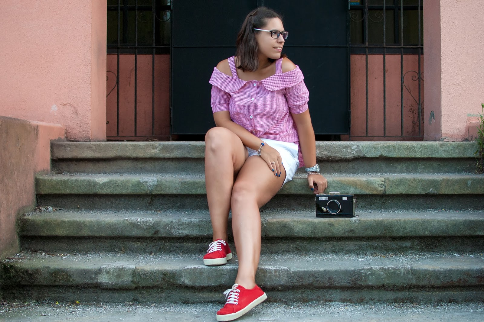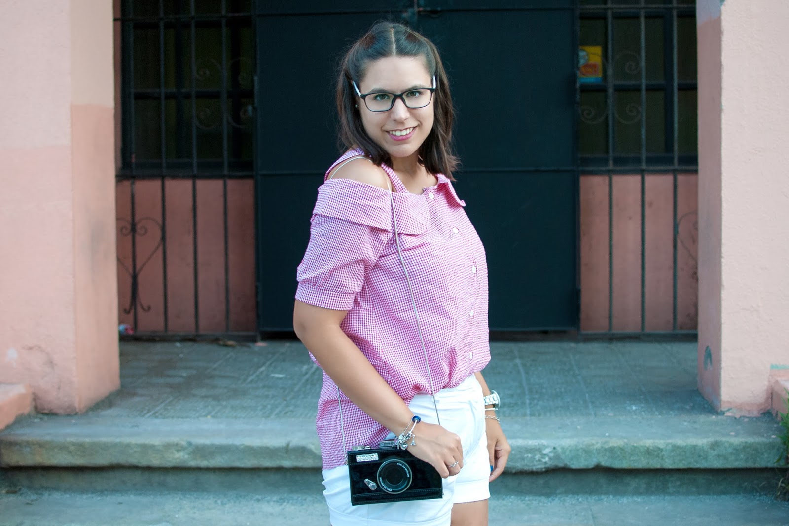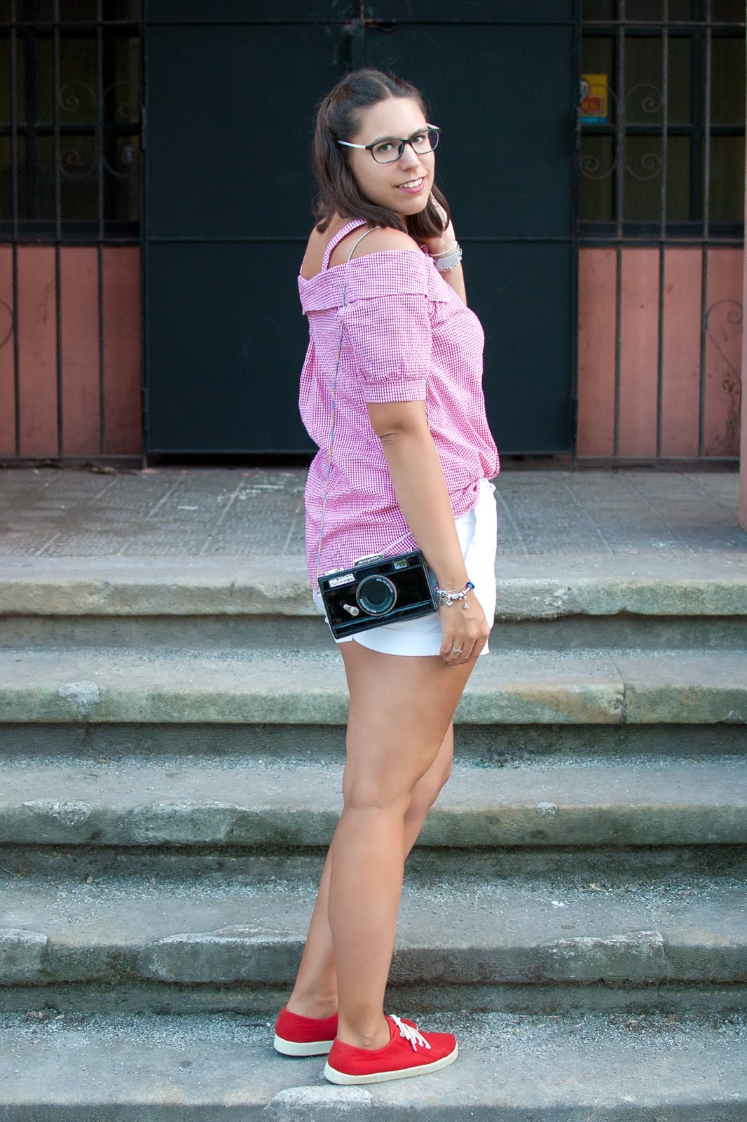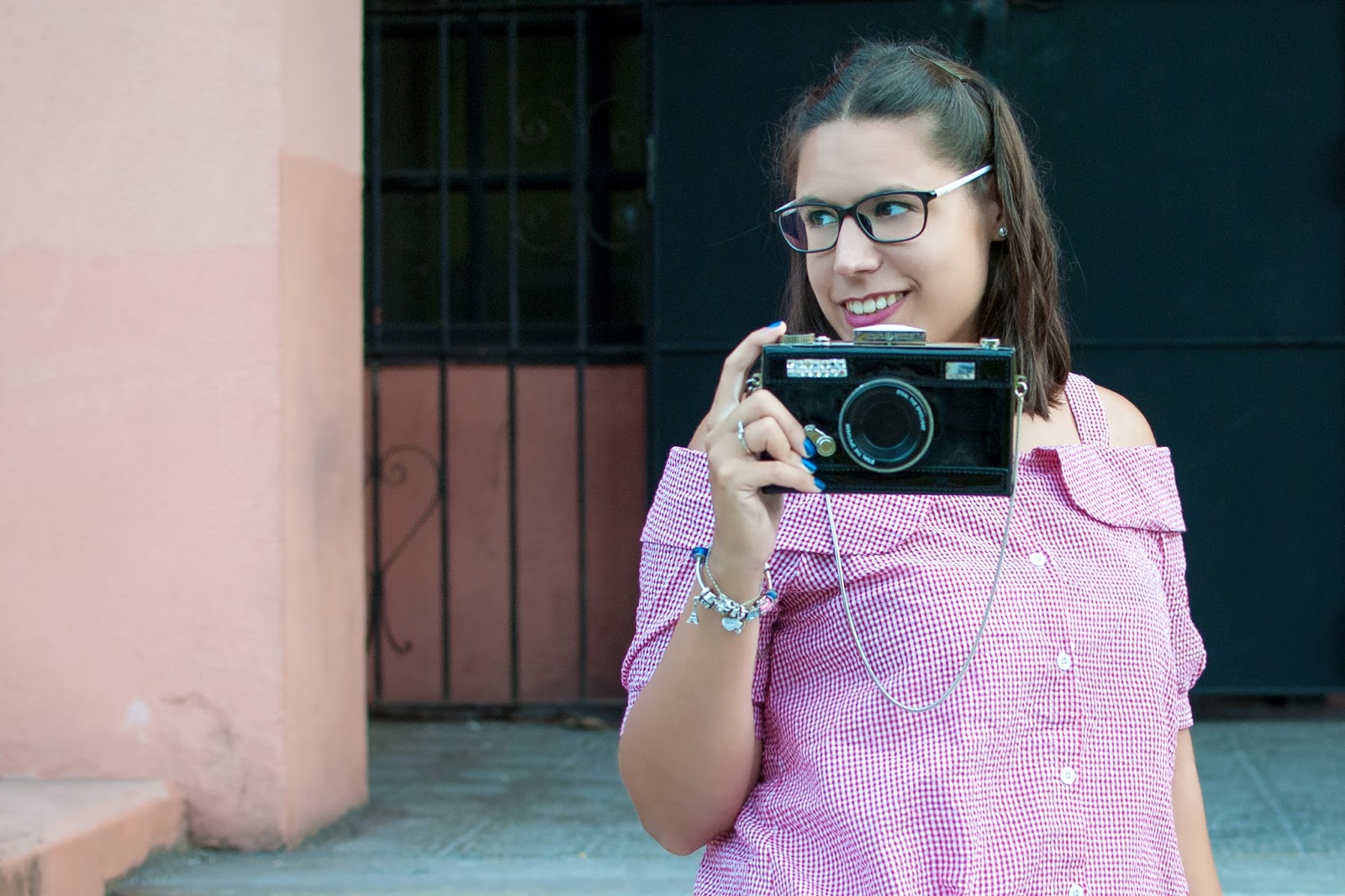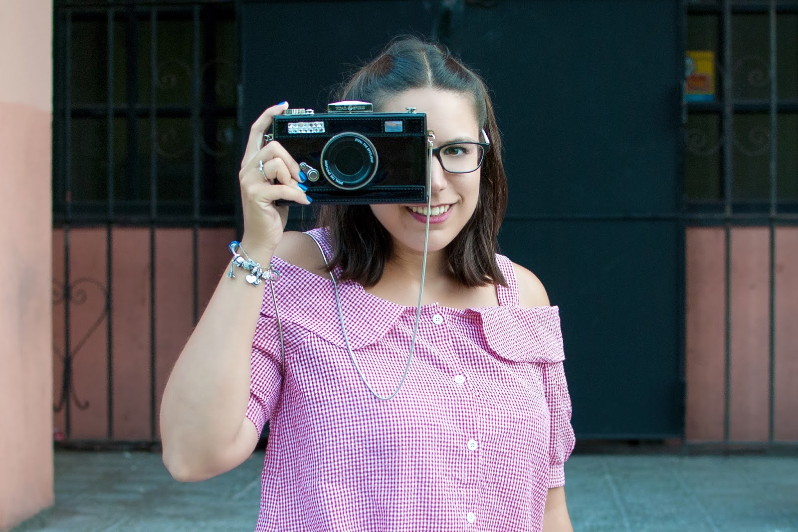 Las cámaras de fotos son una de mis pasiones, igual que la moda y la fotografía. Me encanta coleccionarlas, da igual que sean analógicas, digitales, en forma de collar o, como aquí os enseño, en forma de bolso. Y, ¡ay qué bolso! Nada más verlo en la web, me enamoré y me dije: ¡este tiene que ser mío sí o sí! ❤ No puede ser más bonito y más real, sus detalles están súper cuidados. Lo acompaño con un look cómodo y bastante retro, gracias a esta preciosa blusa de cuadritos vichy. Aunque la lluvia haya llegado por estas tierras… ¡Que no se acabe el verano, por favor! Espero que os guste 🙂