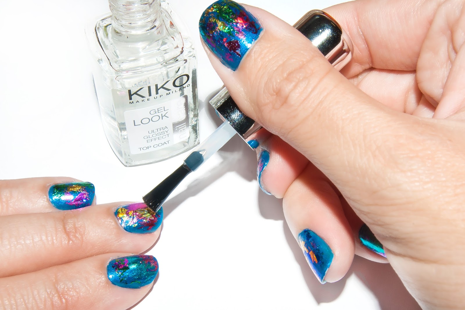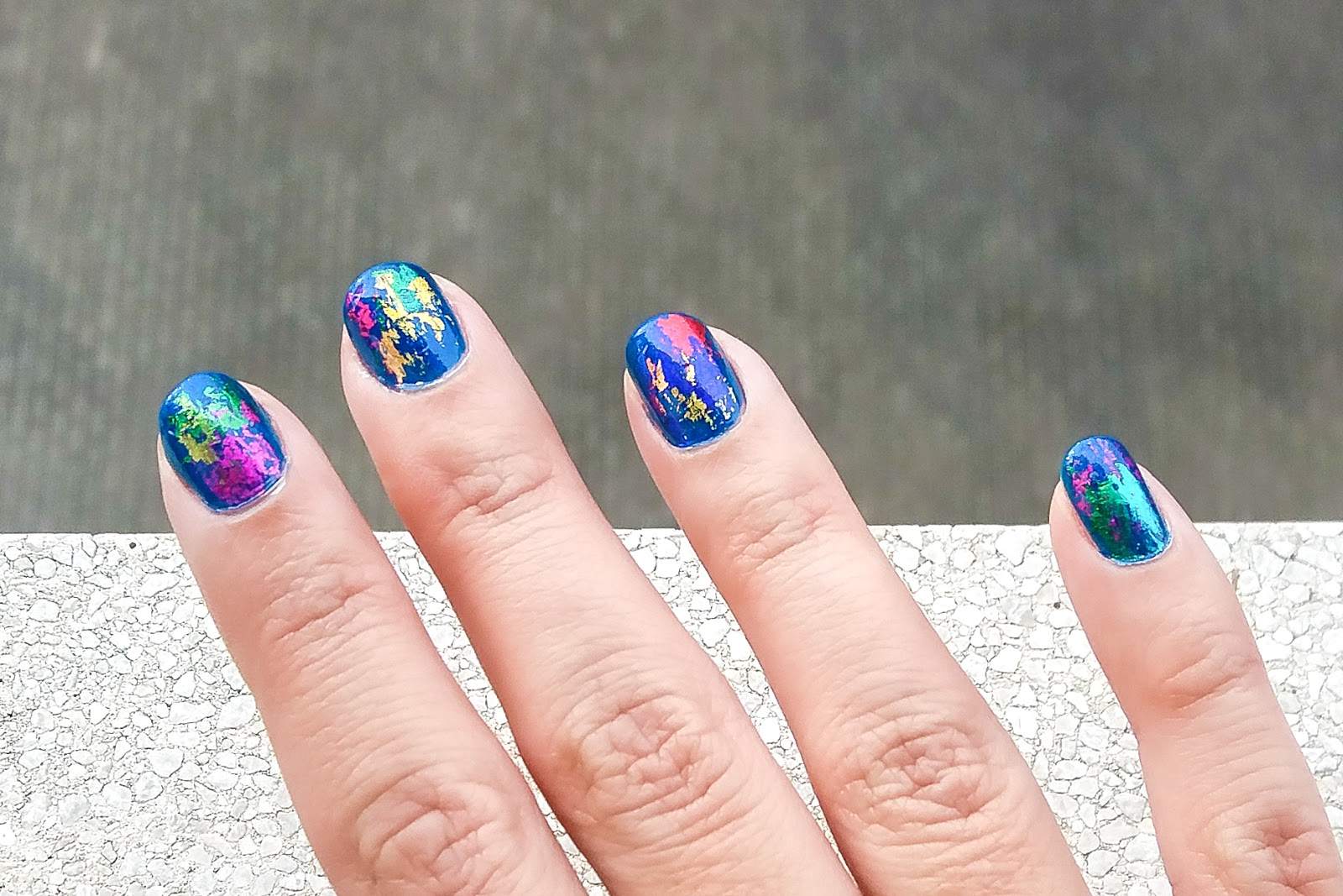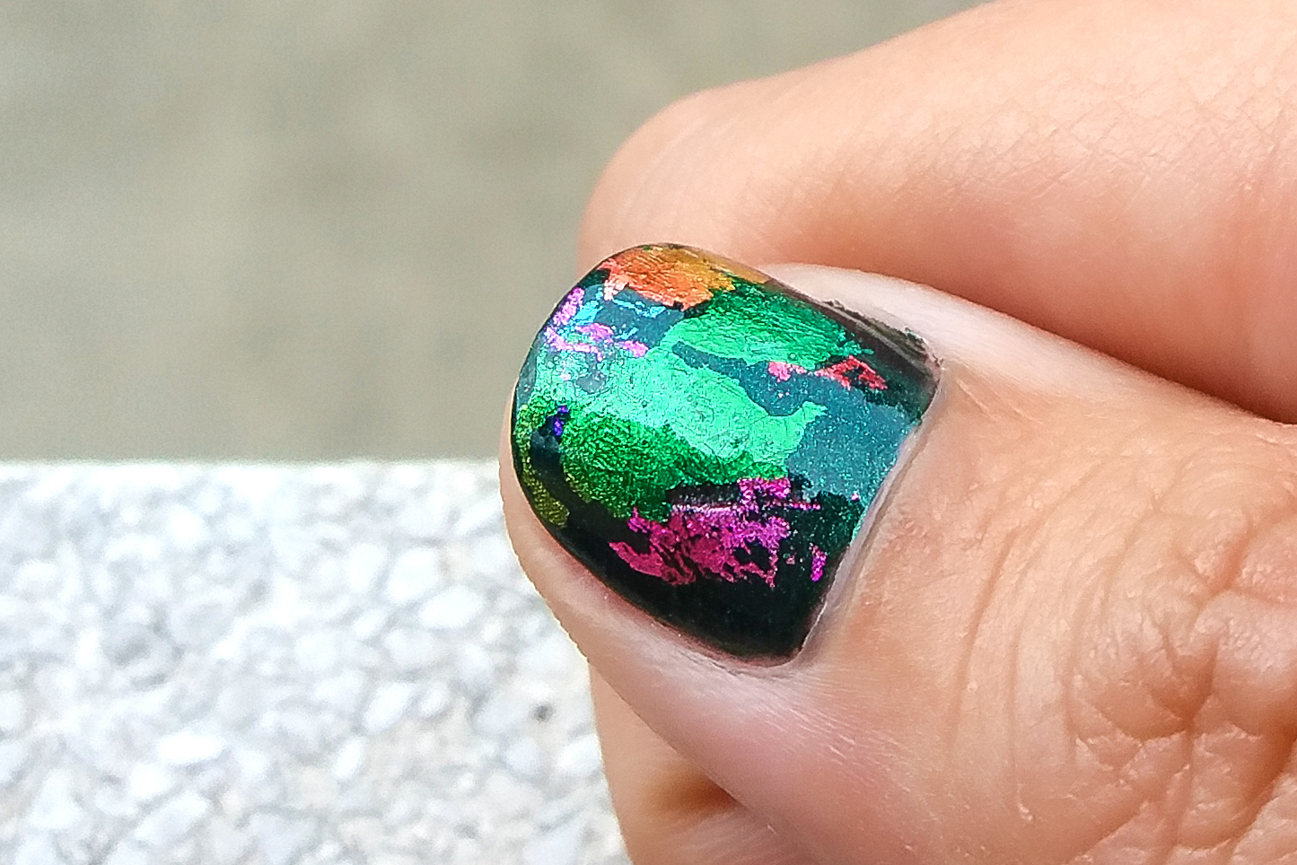 Tercero: ¡es la hora de colocar el papel holográfico! Antes de que la segunda capa del color base esté completamente seco, pegamos el papel y lo fijamos rascando la uña delicadamente. Una vez que se ha adherido, lo retiramos cuidadosamente y repetimos hasta que nos guste cómo queda el diseño o cubrir toda la uña. El proceso es el mismo para todas las uñas. ¿Fácil, no? ¡Combina diferentes colores, no tengas miedo a mezclar! Cuanto más vistosas y originales sean, mejor que mejor ❤