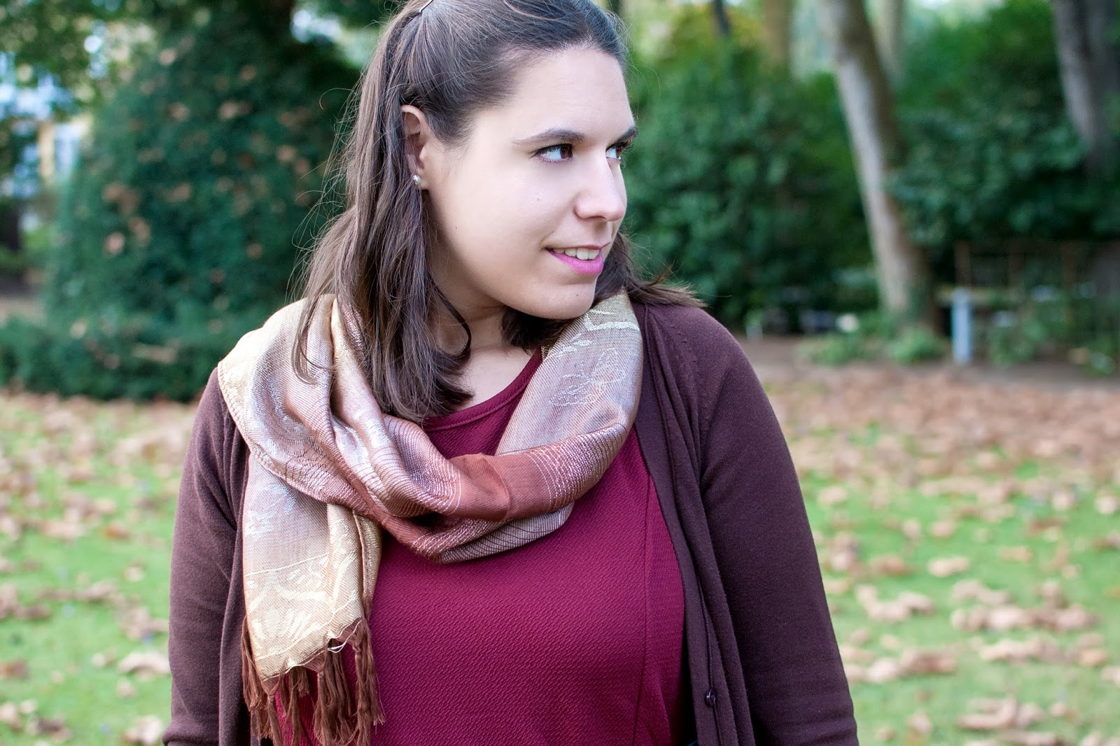 El look en tonos granates me gusta mucho, el vestido muy mono.