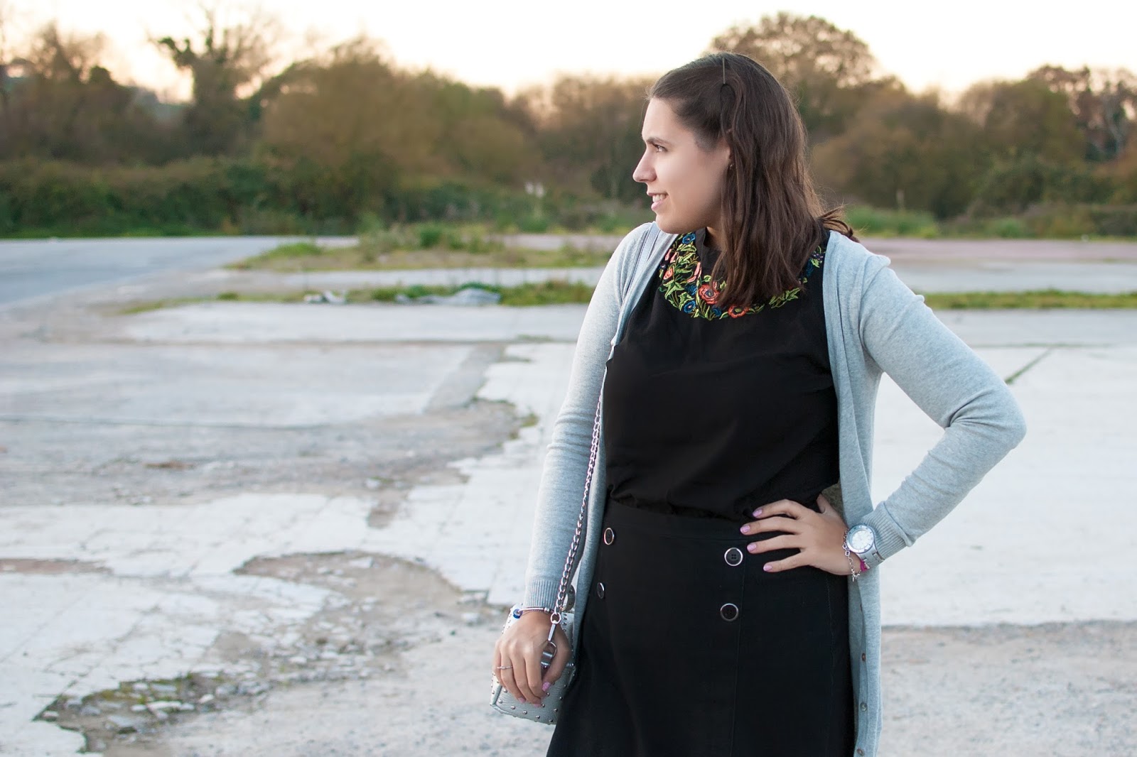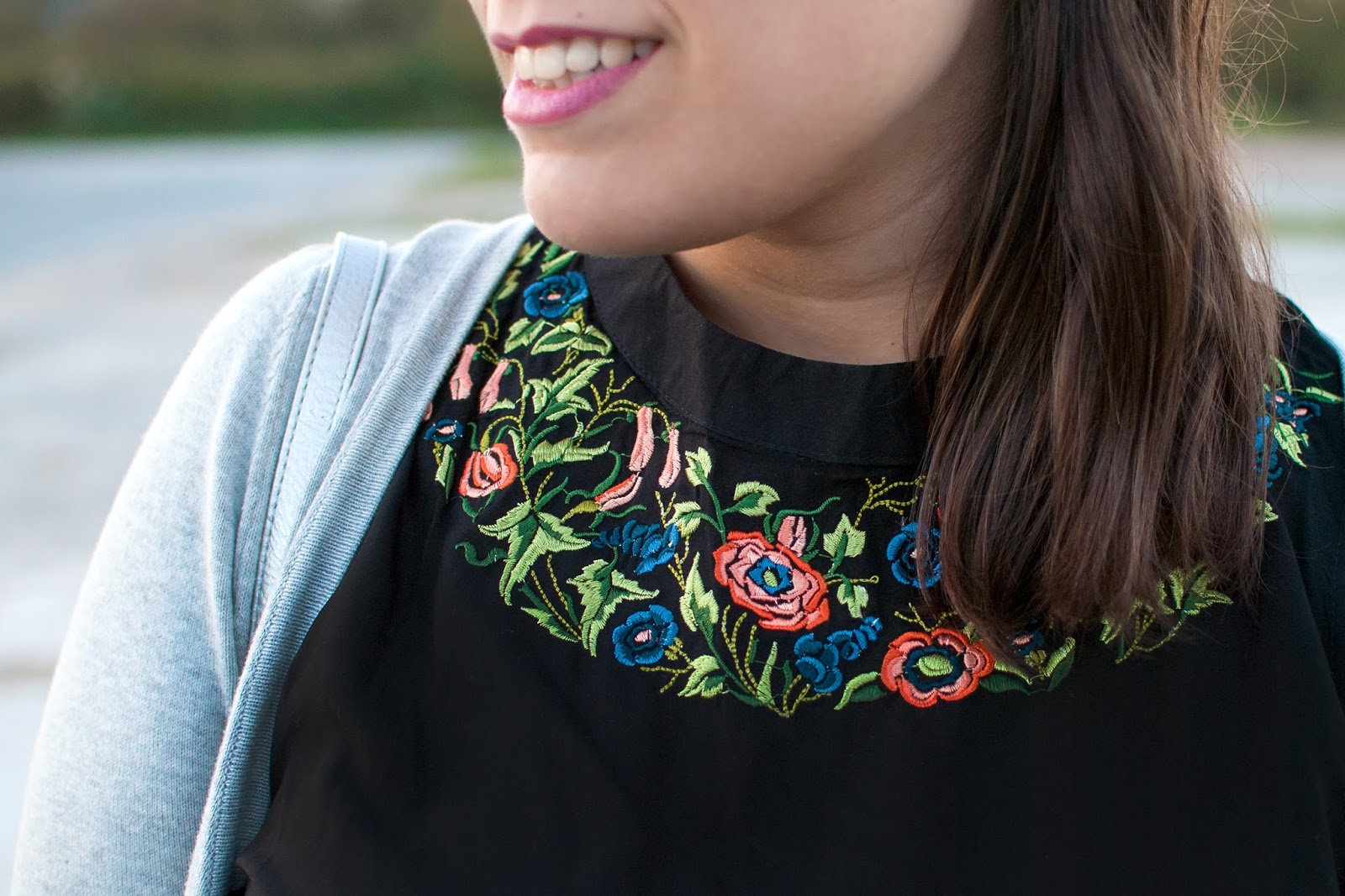 El negro, debido a la elegancia que transmite, siempre ha sido el color por excelencia para los looks de noche. Combina con cualquier color, estampado, textura… y la mayoría de las veces es un acierto seguro. Recuerdo que antes, para mí, era un color que no lo quería ver ni en pintura porque me parecía muy serio y triste, pero ahora se ha convertido en un color clave en mi fondo de armario. ¡Y es que te puede sacar de más de un apuro! En el post de hoy lo combino con gris, que lo dulcifica un montón y le resta formalidad. Aunque el verdadero protagonista es mi nuevo top bordado de Zaful (con flores… ¡qué raro!) que ha sido el punto de partida para crear este look, perfecto para cualquiera cena o salida navideña. ¡Qué ganas de que llegue el verano y poder mostrarlo sin chaqueta! Espero que os guste y feliz semana ❤