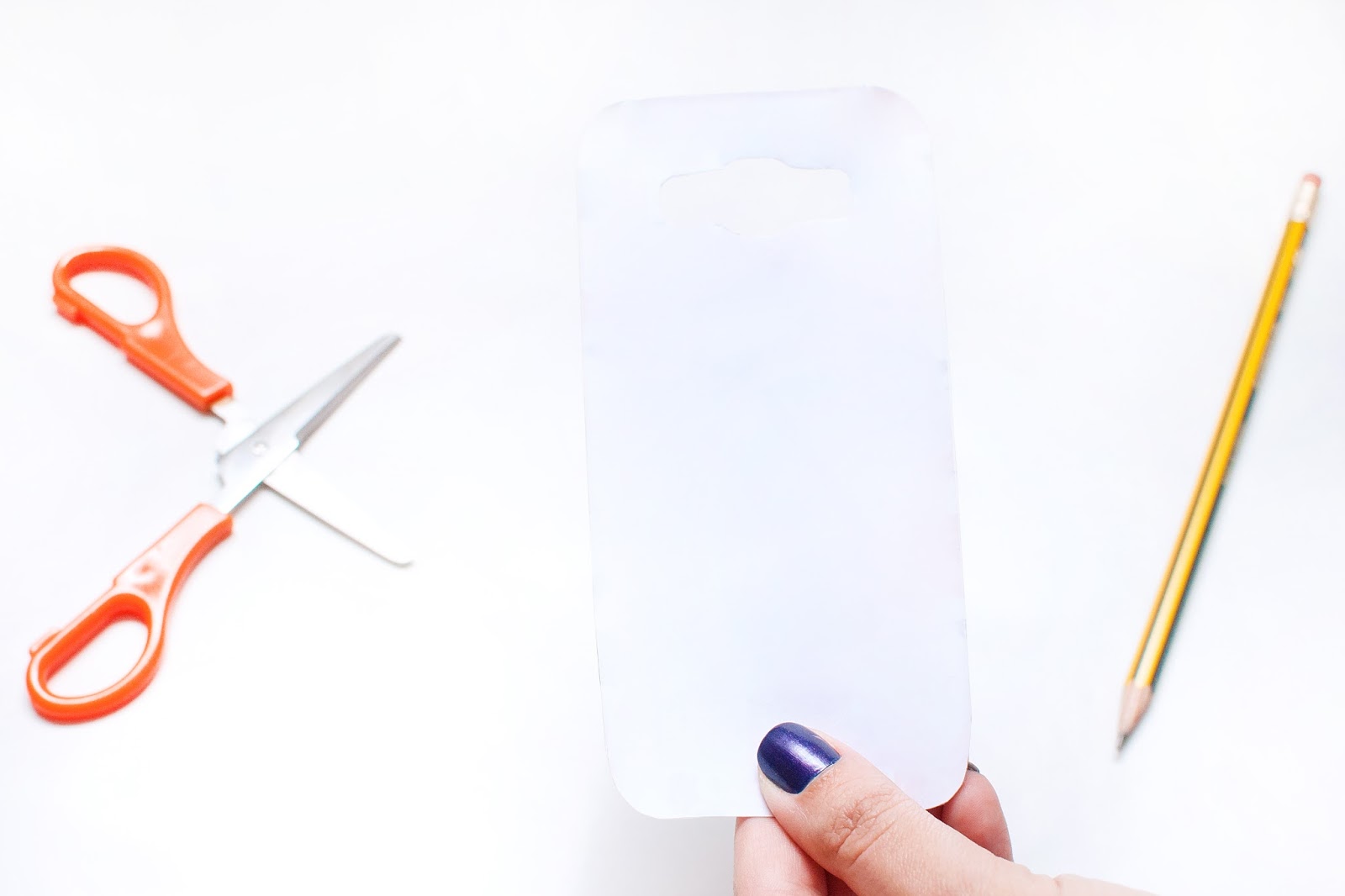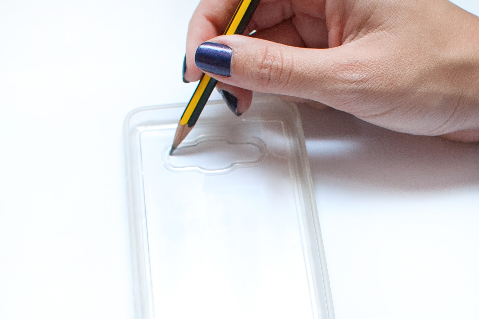 Segundo: a continuación, colocamos la carcasa transparente encima del contorno que hemos dibujado. La centramos bien y dibujamos el hueco del altavoz, la cámara y el flash. La recortamos y ¡ya tenemos lista nuestra plantilla!