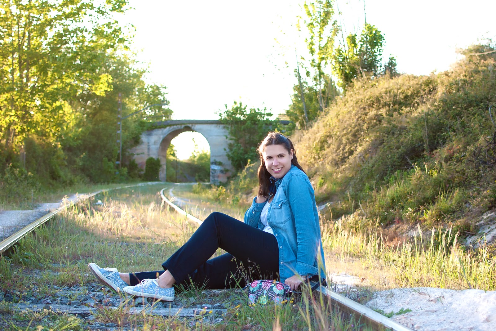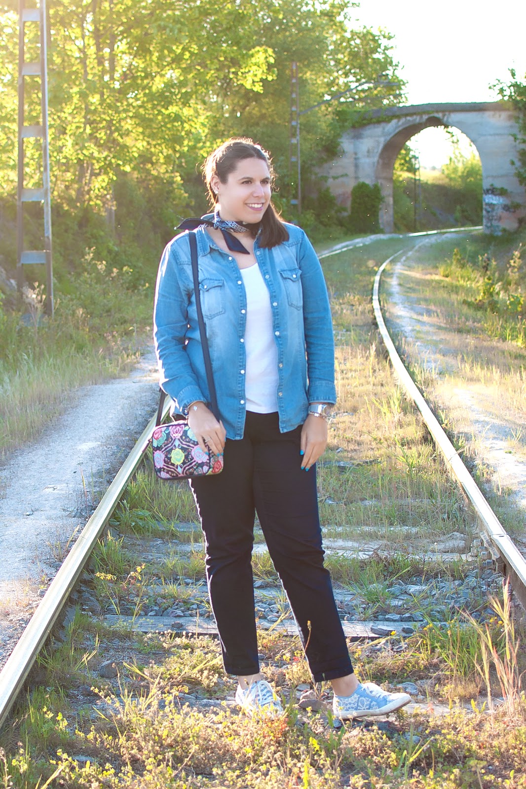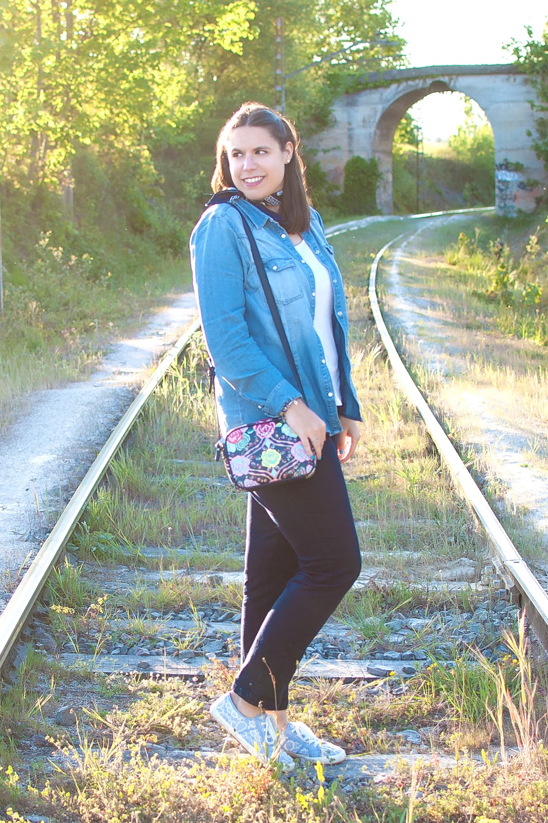 Los atardeceres en primavera tienen un toque mágico, es genial salir a fotografiar a estas horas. ¡Me encantan sus colores y sus juegos de luces y sombras! El buen tiempo nos acompañó hasta hoy, pero tengo la esperanza que nos volverá a visitar muy pronto y podamos seguir disfrutándolo un montón. De momento, yo lo recuerdo con este look en denim y esta bonita sesión en unas viejas vías del tren. ¡Adoro como han quedado y todo gracias a mi querido fotógrafo! Este tipo de outfits son a los que más recurro por semana, son súper cómodos y perfectos para aguantar la rutina del día a día. Sólo hay que añadir complementos y accesorios que marquen la diferencia y muestren nuestra personalidad, como mi bolso floral de Tous y una bandana al cuello. Espero que os guste y muy feliz semana ❤