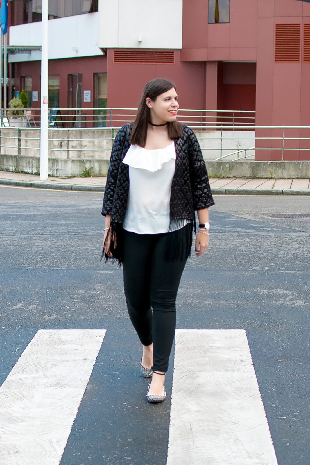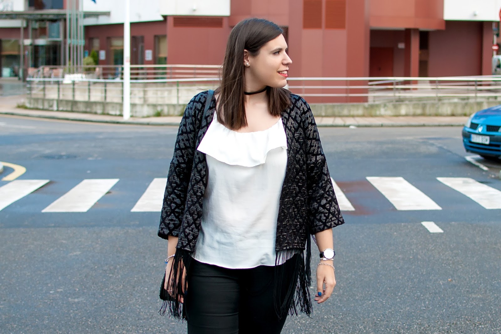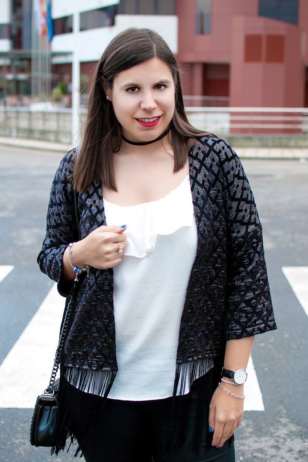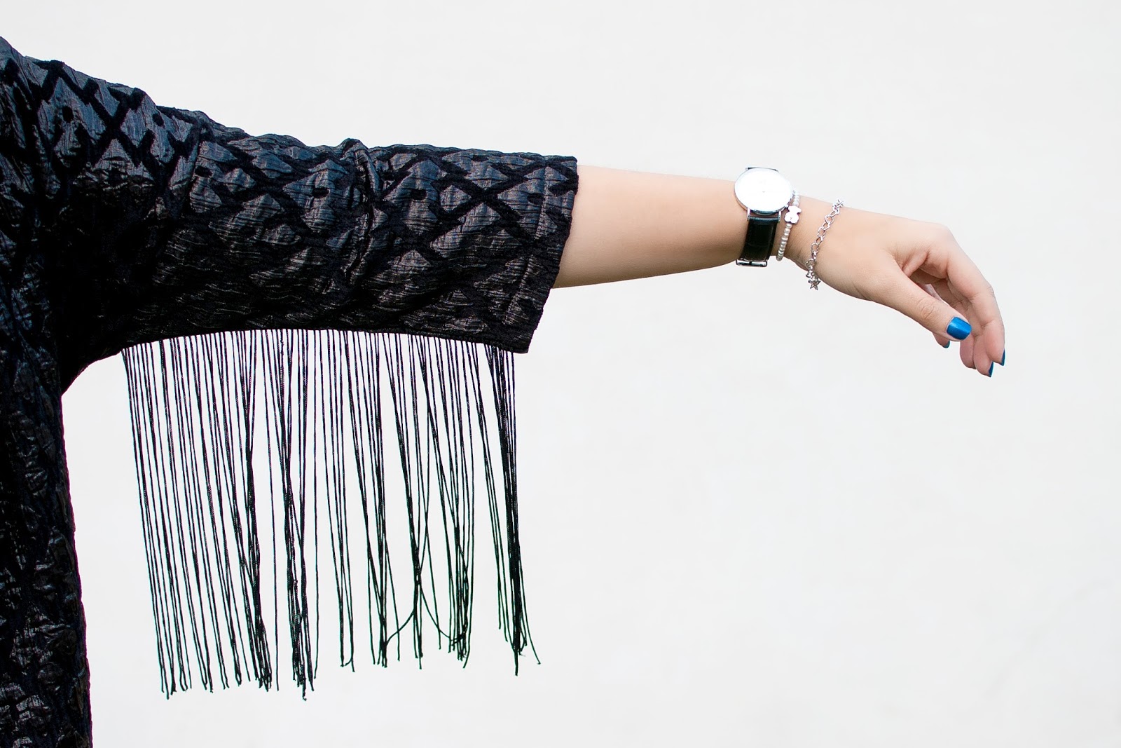 Me encanta el outfit entero, en especial el kimono, es que los flecos son tan bonitos! El reloj es genial, yo lo tengo en marrón y queda muy elegante ^^