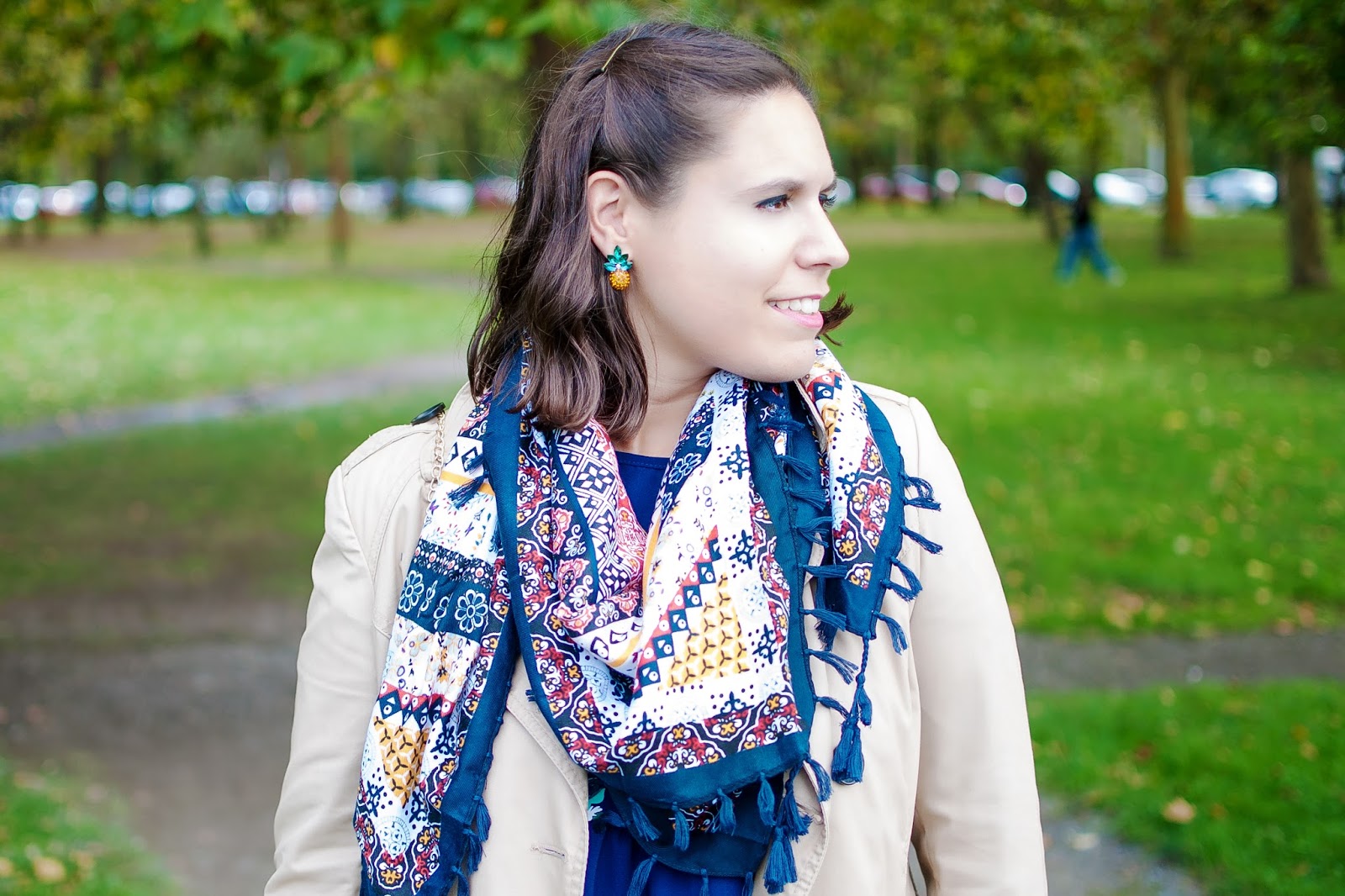 El azul marino apetece en todas las estaciones, pero a mí me apetece más aún en el otoño. Quizás es que en esta época del año me llaman más la atención las prendas de tonos oscuros pero no quiero caer en la total oscuridad del negro, por eso, este tono es el perfecto. Os enseño uno de los últimos vestidos que han entrado en mi armario, con volantes y flores (¡qué raro para mí!). Es de Zaful, una de mis webs favoritas en estos momentos. Lo acompañé con un bolsito muy cuqui y un pañuelo que es el complemento ideal para cuando las temperaturas descienden al atardecer. ¡Y que no falten las piñas aunque no sea ya verano!