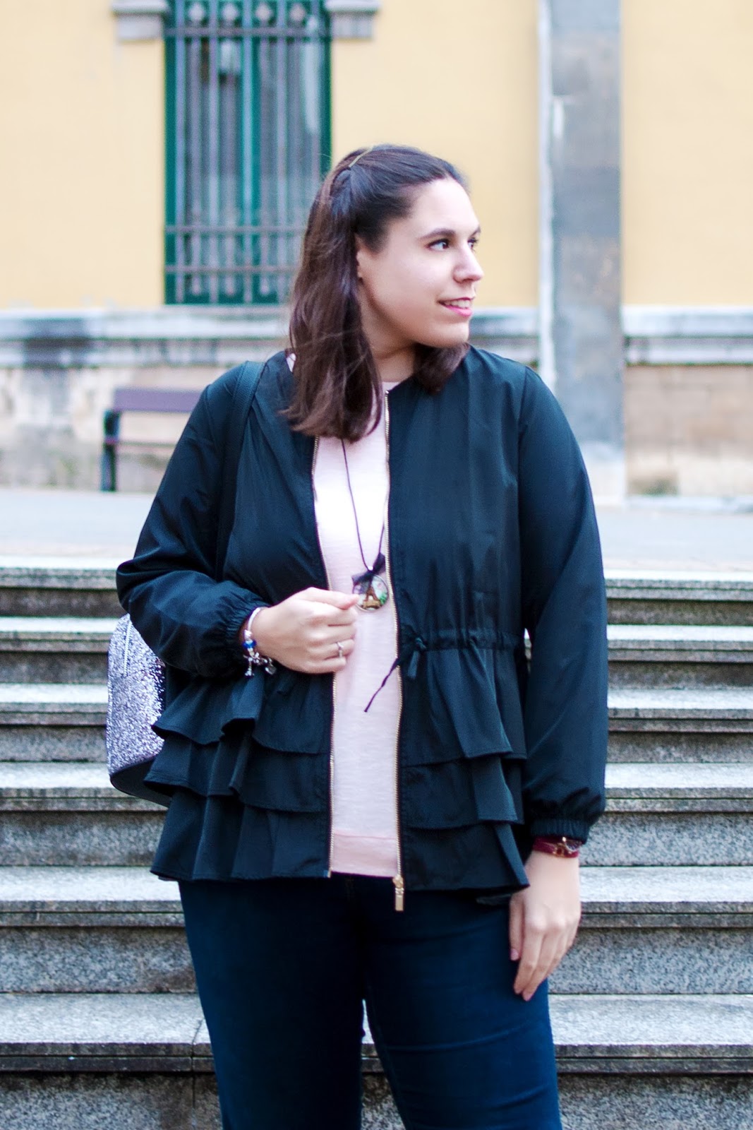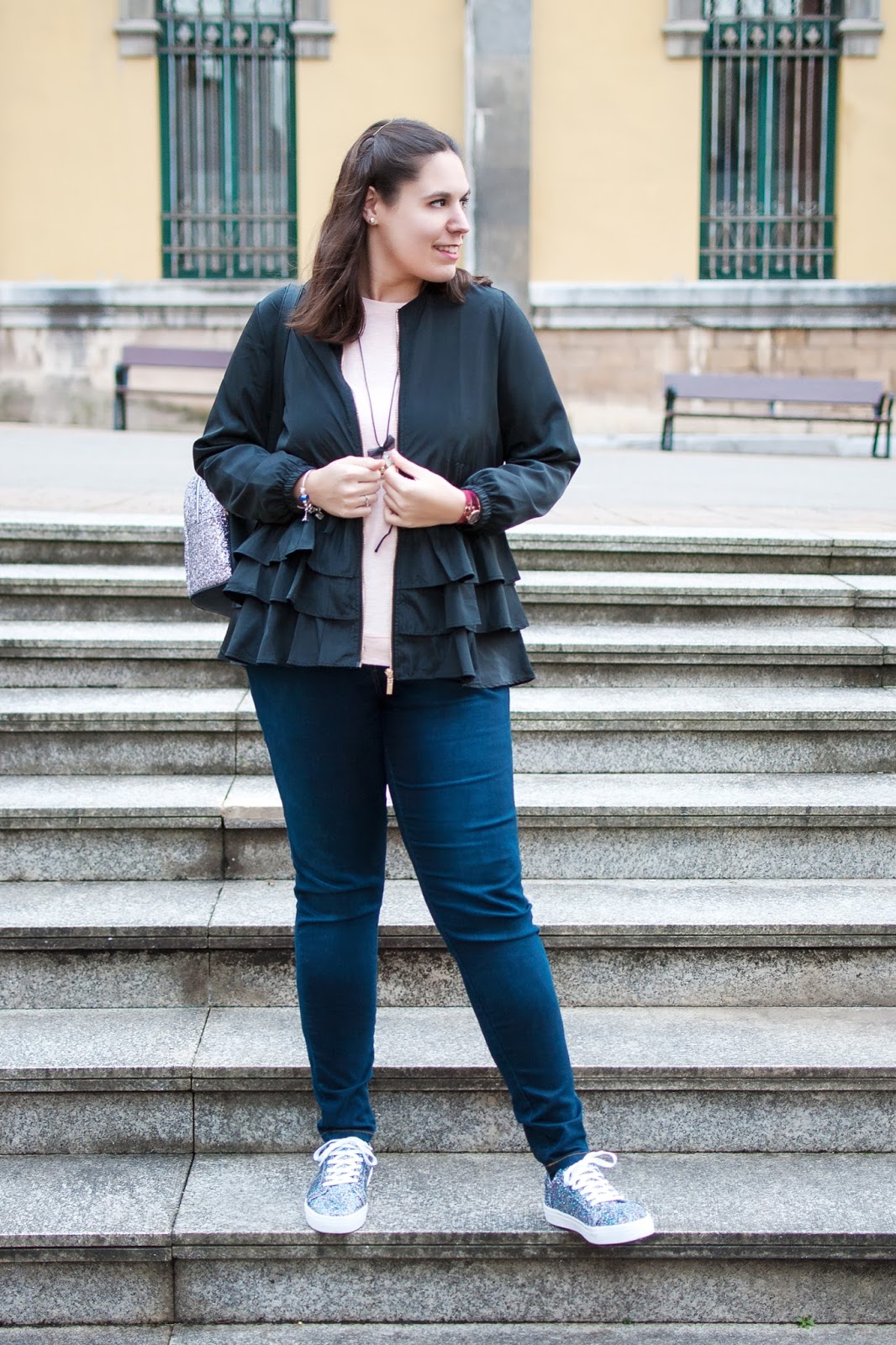 ¡Muy bien escogida la chaqueta! Es perfecta para el entretiempo, pero con los volantes tiene un toque especial que hace que sea menos sosa que un chubasquero o gabardina ¡Me ha encantado! Y el detalle de glitter en los complementos le da un toque muy juvenil y mucha luz ♥♥♥