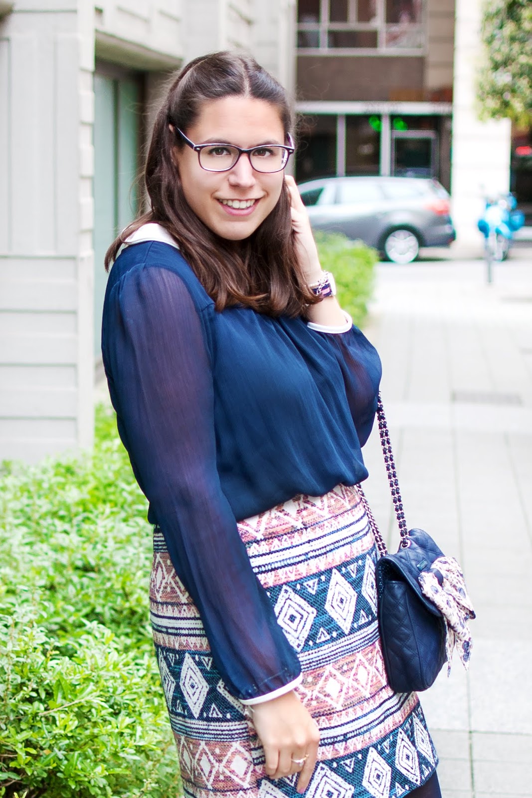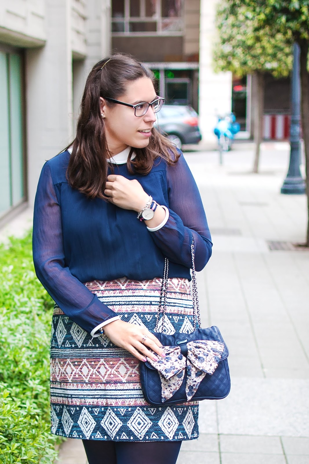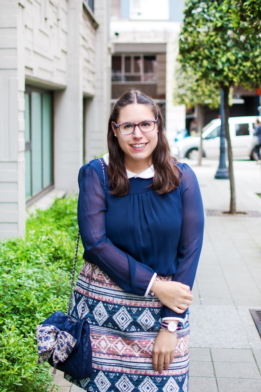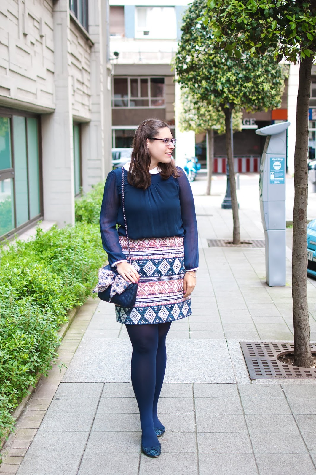 Aunque ya hayamos entrado en junio, por el norte no lo parece… El sol sigue sin aparecer y las chaquetas, todo lo que tenga manga larga e incluso las medias (¡sí, las medias!) siguen siendo claros protagonistas de nuestros looks diarios. ¡A ver quién es el valiente que se atreve a poner sandalias! Aunque bueno, aquí ya lo sabemos de sobra: el tiempo puede dar un giro inesperado de un día para otro y corriendo a cambiar al armario de verano. Como yo todavía sigo a la espera, os enseño otro outfit de entretiempo donde todo gira alrededor de esta falda étnica tan requete bonita. Vino conmigo del Mediterráneo, allá por agosto del año pasado, y todavía no había tenido la oportunidad de tener un huequito aquí. Aposté por el azul y la combiné con mi blusa con cuello bebé que nunca pasa de moda y complementos también en la misma tonalidad. Espero que os guste y feliz semana ❤