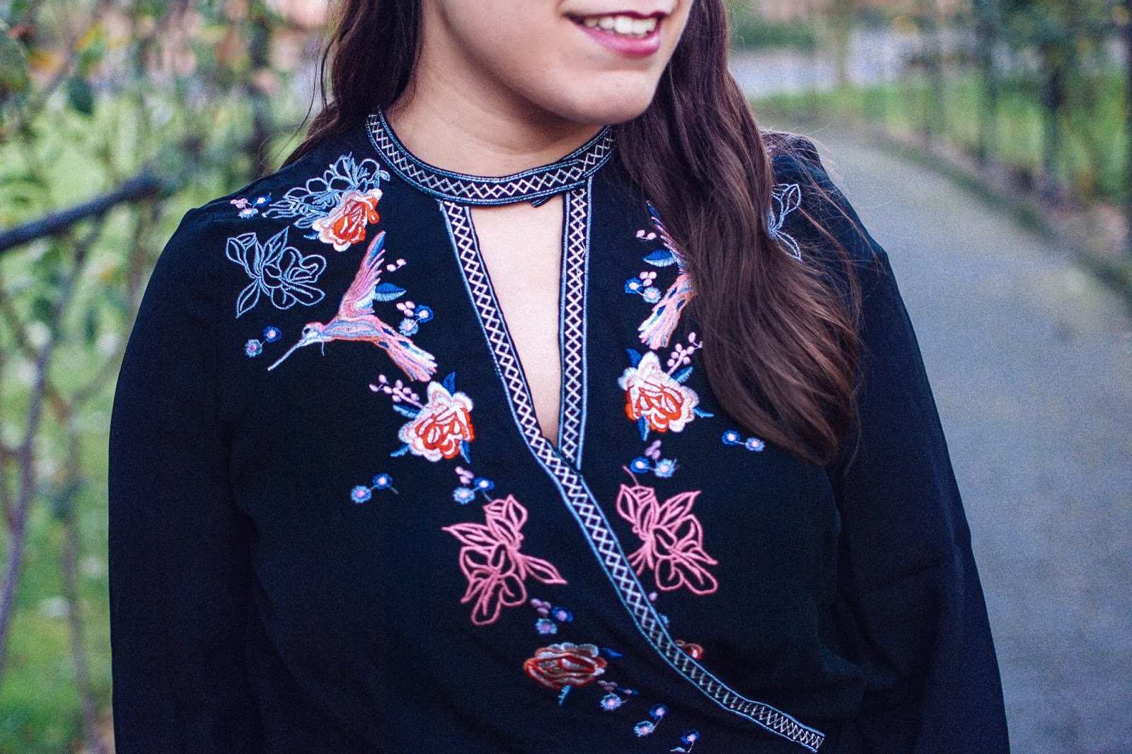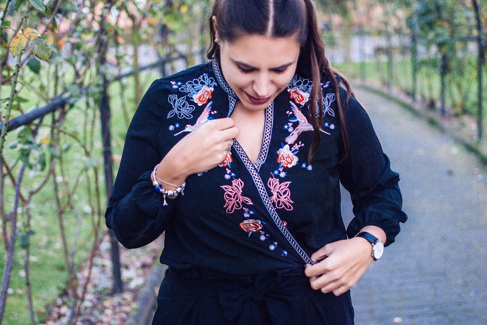 ¡De vuelta al negro! Este es el perfecto resumen para definir en una pequeña frase mi look de hoy. Cada día me gusta más este color y no puedo evitar que se me vayan los ojos en cada tienda hacia prendas de este tono. ¡Y ya no os digo nada si van acompañadas de lentejuelas! O como en este caso, con aires florales. Adoro los detalles de esta blusa: su corte, su bordado y, sobre todo, que se abroche en el cuello le da un toque muy especial. Es de Banggood y me encanta porque al combinarla con un short de cintura alta parece un mono y creo que queda un conjunto muy elegante de cara a las fiestas navideñas. Como complementos: bolso y francesitas glitter, para que este outfit triunfe aún más.