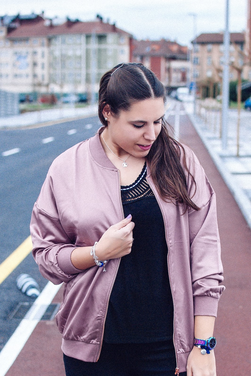 ¿Bonita época, verdad? Minifaldas, cardados, maquillajes estridentes, colores flúor, el estampado de leopardo como rey de los looks… Y, como no, ¡las chaquetas bomber! Yo revivo esta tendencia que tanto juego dio en esa década con esta nueva pequeña joya de mi armario. Es de Hunkemöller, una marca con una sección especializada en mallas deportivas, sujetadores deportivos y, por supuesto, ropa deportiva en general. Esta chaqueta pertenece a su colección Doutzen y me parece preciosa por todos sus detalles: su rosa satinado, el aro en la cremallera y lo perfecta que es para el día a día. ¿Os gusta? Para resaltarla, opté por un total black look que no me puede gustar más. ¡Seguro que no me canso de usarla de cara a la primavera! Espero que os guste y feliz semana ❤