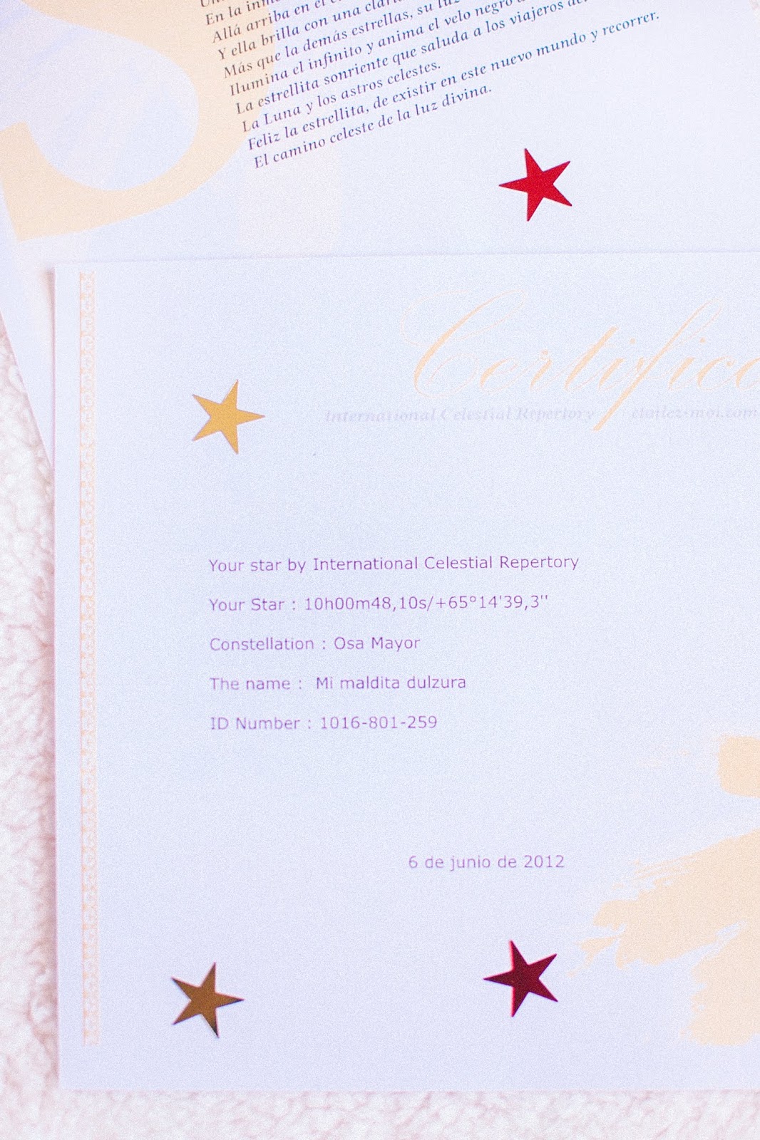 ¡Ha nacido una estrella y se llama Mi maldita dulzura! Sí, como lees, y es todo gracias a Etoilez-Moi, una empresa francesa que se dedica a bautizar estrellas con el nombre y la fecha que nosotros deseemos, además de elegir también la constelación para que así pueda estar lo más personalizada posible. Lo realizan a través del International Celestial Repertory, registro oficial de identificación de estrellas, por lo que te garantizan que esa estrella es única (sólo tuya). Creo que es un regalo súper especial y original (en su web tienen un montón de packs para cumpleaños, bautizos, San Valentín…), perfecto para estas Navidades porque ¿a quién no le gustaría brillar en el universo a través de una estrella? A mí me han enviado el pack ‘Estrella fugaz’ en su versión económica y recibí directamente los documentos al email: el certificado de registro, el mapa celeste, la ficha de la constelación y un precioso poema. ¿Sencillo y cómodo, verdad? ¡Pues anímate y regálasela a tu persona más especial! Espero que os guste y feliz semana ❤
