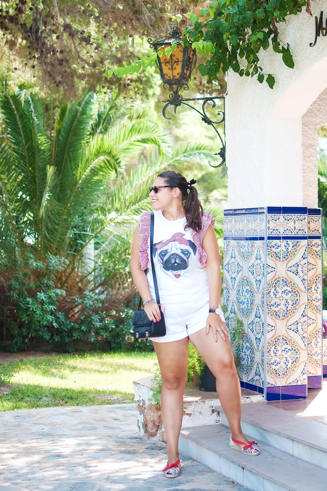 Por lo menos por aquí por Asturias, el verano no quiere irse de nuestro lado y yo soy más feliz que unas castañuelas. Los looks veraniegos siguen formando parte de mi día a día y espero que por mucho tiempo más porque en el norte el invierno se hace demasiado largo. La protagonista del outfit de hoy es esta dulce camiseta, un flechazo en toda regla que hasta que no me hice con ella… ¡No paré! La adoro por su bonito dibujo, por sus volantes, por sus cuadritos vichy… Es perfecta para llevarla tanto por fuera como por dentro del pantalón y la verdad es que se ha convertido en mi camiseta más top de esta estación. Creo que representa totalmente mi personalidad y mi forma de ser, y es una de las cosas que más me gustan de la moda: poder adaptarla absolutamente a ti. La combiné con mis shorts en blanco y mis inseparables alpargatas de Lucía Be que nunca me cansaré de poner. Espero que os guste y feliz semana ❤