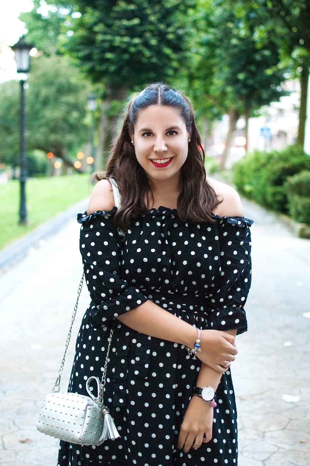 Hoy por hoy, puedo decir que el negro se ha convertido en uno de mis colores favoritos a la hora de vestir en todas y cada una de las estaciones. Lo admito: me requete encanta. Adoro lo versátil que es y que, gracias a él, cualquier look será un éxito asegurado. Hoy lo acompaño con mini lunares blancos en un preciosísimo vestido largo cargado de tendencias: hombros al aire, volantes y una bonita lazada en la cintura. Es de la tienda Maximalistas, una nueva web que acabo de descubrir y que está llena de prendas monísimas y complementos. ¡No os olvidéis de echarle un vistazo y aprovechad el descuento del 20% con el código DulzuraMXM, os encantará! Para cerrar el outfit: accesorios en plata y mi parque favorito de la capital, el San Francisco. Además… ¡No te pierdas los ‘Women polka dots maxi‘ vestidos de Dresshead, te encantarán! Espero que os guste y feliz semana ❤