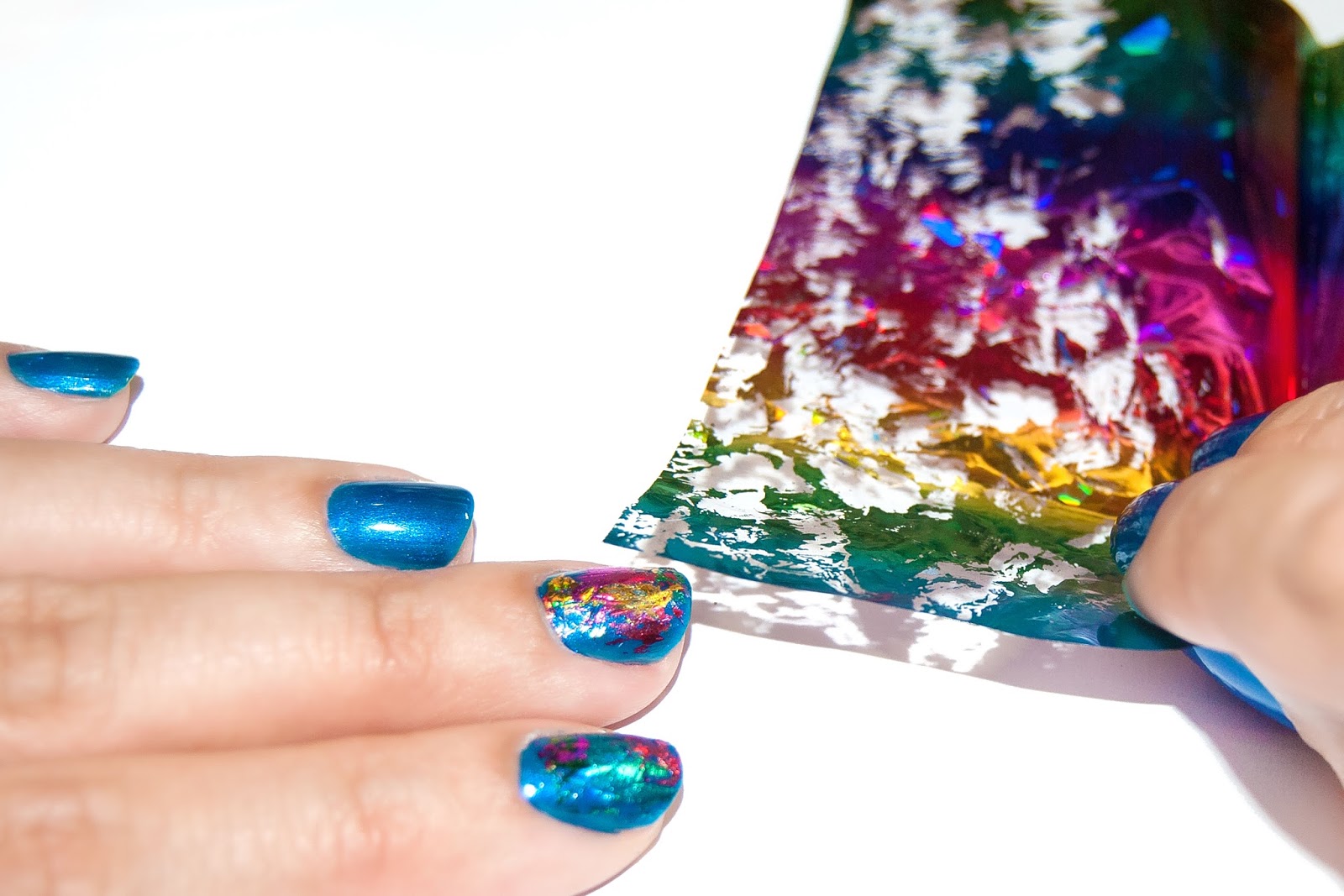 Tercero: ¡es la hora de colocar el papel holográfico! Antes de que la segunda capa del color base esté completamente seco, pegamos el papel y lo fijamos rascando la uña delicadamente. Una vez que se ha adherido, lo retiramos cuidadosamente y repetimos hasta que nos guste cómo queda el diseño o cubrir toda la uña. El proceso es el mismo para todas las uñas. ¿Fácil, no? ¡Combina diferentes colores, no tengas miedo a mezclar! Cuanto más vistosas y originales sean, mejor que mejor ❤