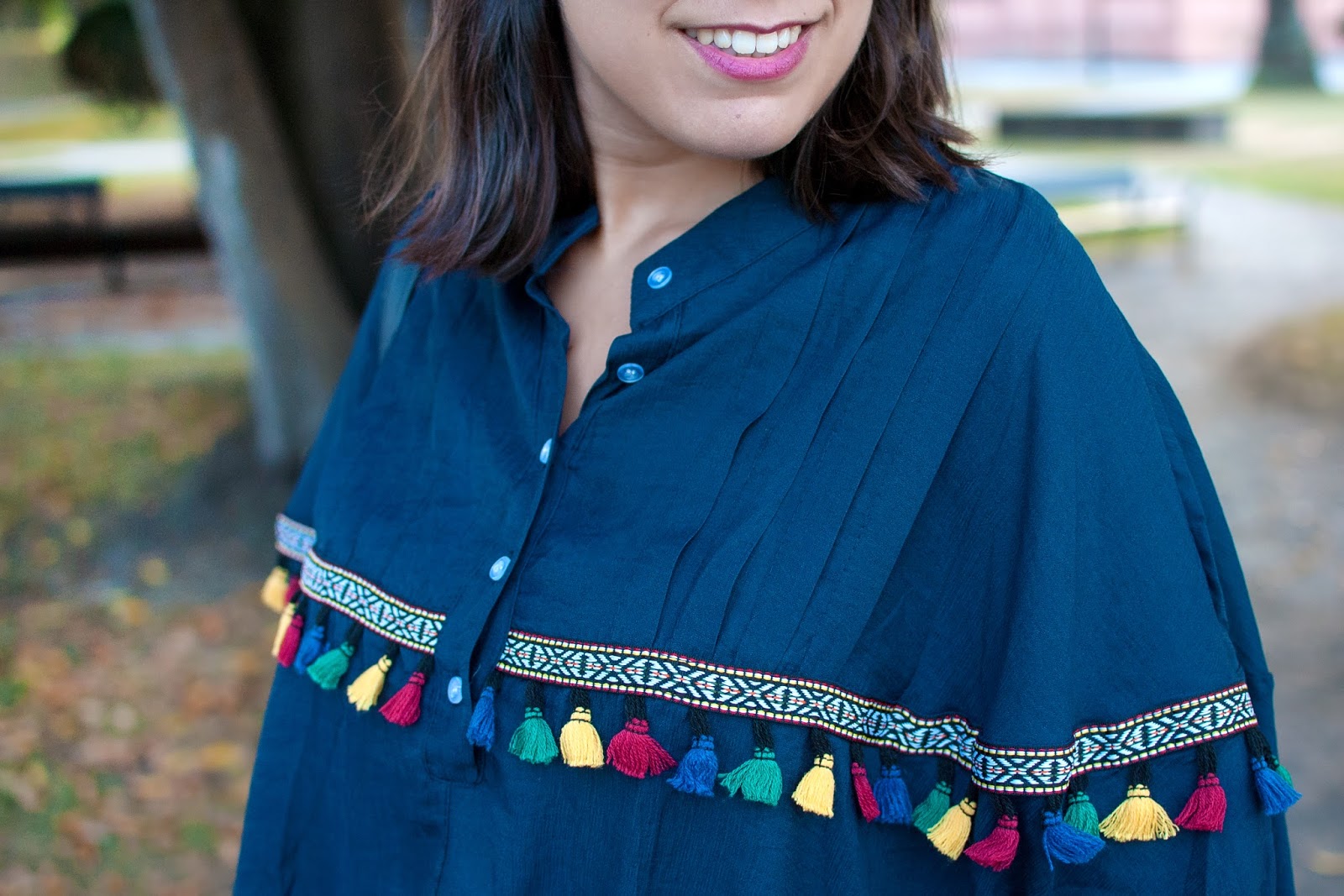 Qué blusaaaa, yo he sido una enamora esta temporada de borlas, pompones y todo lo boho, ese look te queda súper bonito, me encanta; mí otoño en cambio está loco, días calurosos aún y otros fríos pero bueno todo se disfruta.