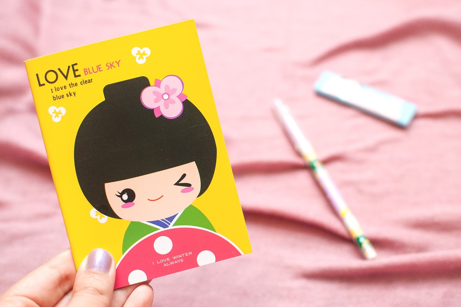 – Kokeshi notebook, friendly bear color pen & stick chewing gum eraser –