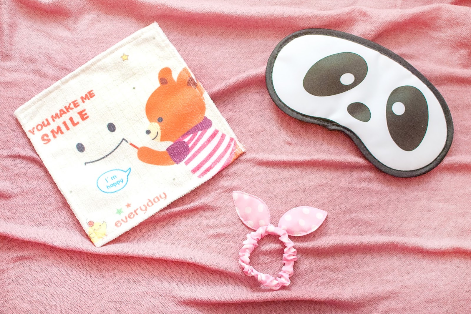 – Happy mini towel, polka dot hairband & panda sleepmask –