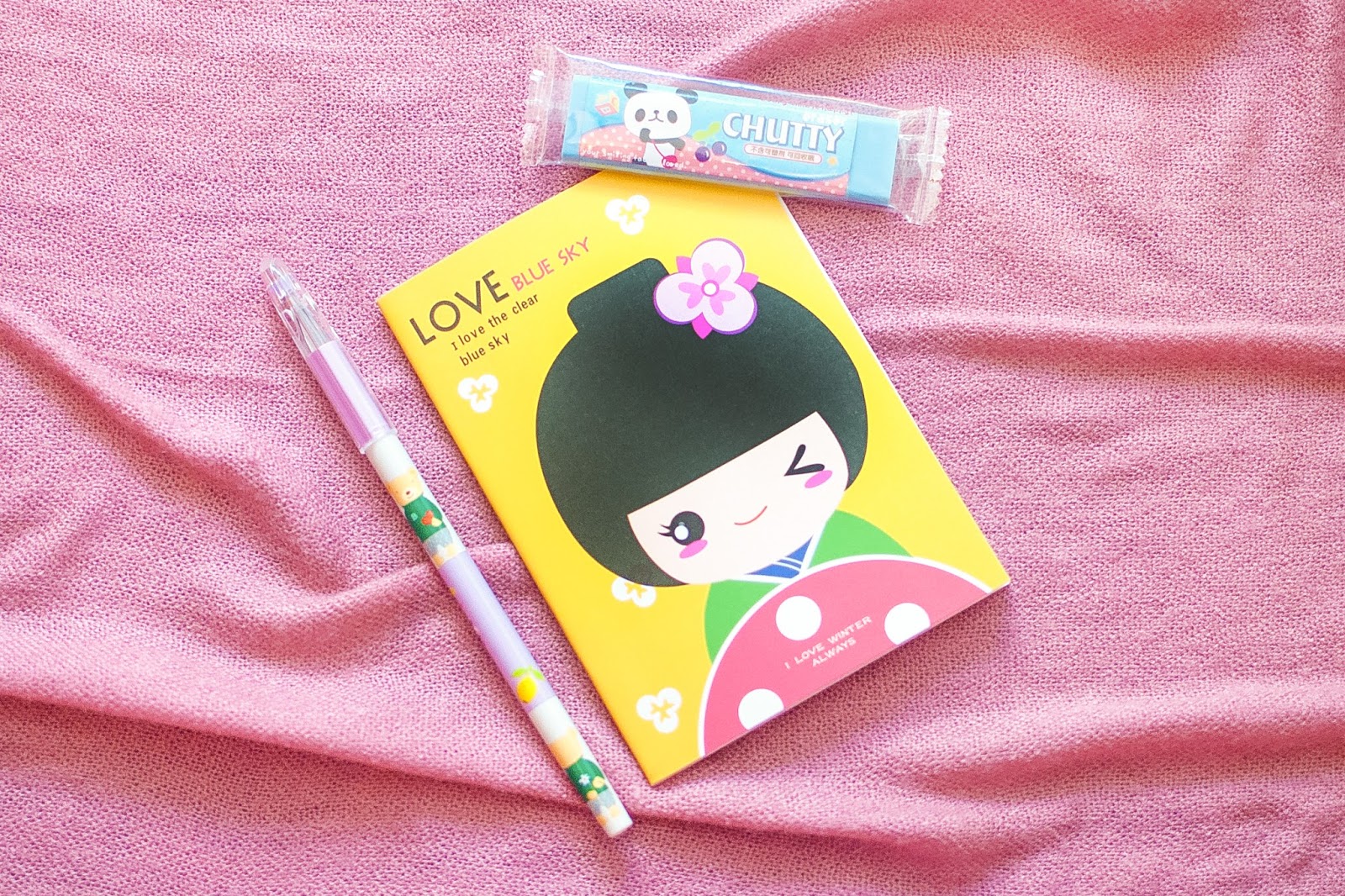 Mini libreta de rayas con ilustración japonesa, bolígrafo de tinta morada con un osito monísimo y una goma en forma de chicle con olor a cereza que huele muy, muy rica. ¡Los mejores compañeros que puedes llevar a clase!