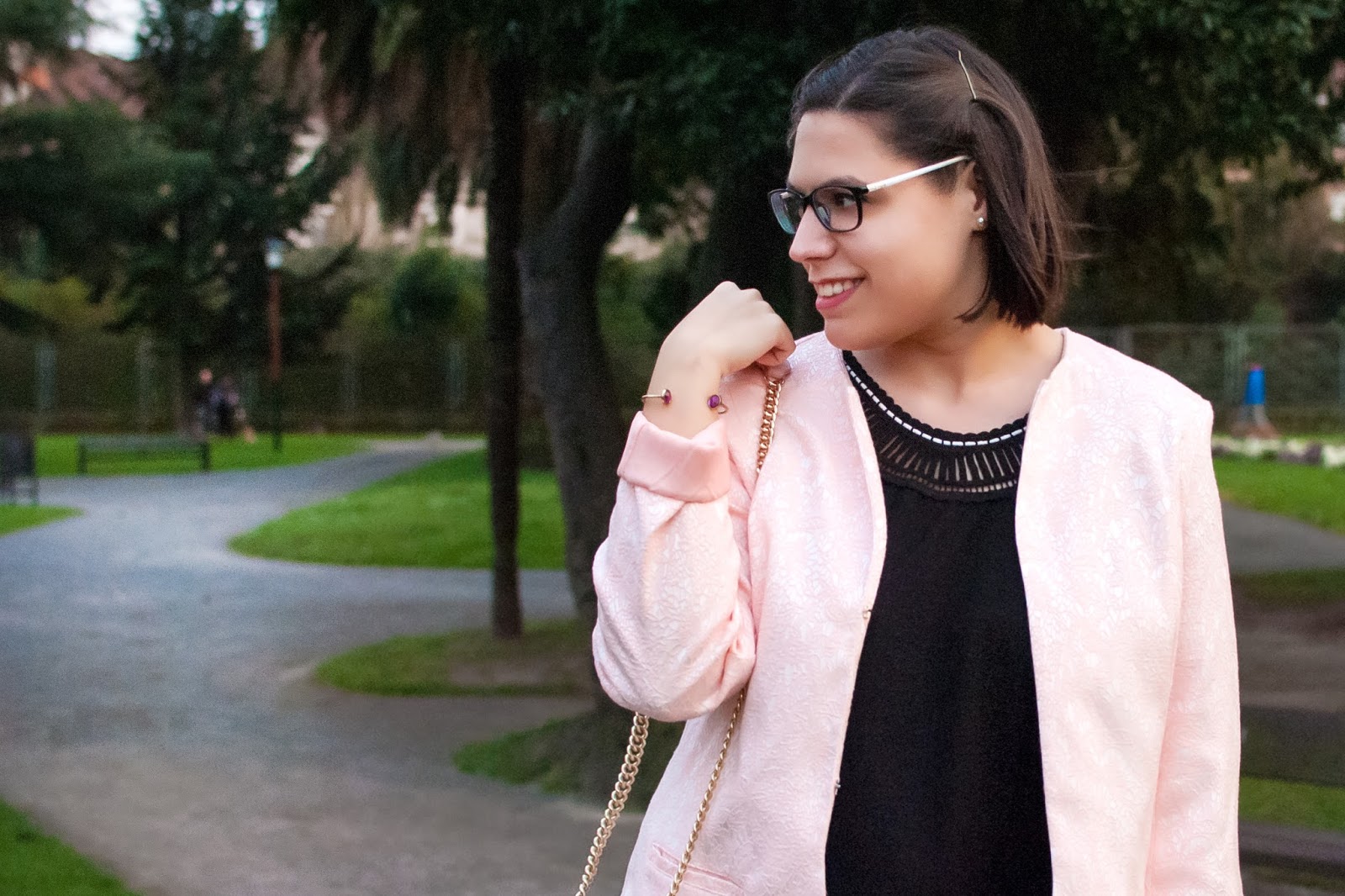 La primavera ya ha llegado oficialmente, aunque por aquí todavía no se ha asomado ni un poquito. ¡Llueve, llueve y no para de llover! Mientras la espero, os enseño lo que elegí para el invernal día de Ramos que tuvimos (encima de esto tuve que llevar otra prenda de abrigo porque hizo ¡un día malísimo!) . El protagonista era el bonito color de la temporada, el rosa cuarzo. Me transmite dulzura, elegancia, felicidad… ¡Adoro este color y adoro verlo en todas las tiendas! Estreno también mis nuevos tacones, un chollazo de esos que te encuentras y tienes que llevarlo a casa sí o sí porque jamás volverás a verlo. ¡Por fin unos zapatos de tacón moderado! Anda que no he buscado unos así durante un montón de tiempo, qué emoción al encontrarlos. Como toque final, mis nuevas gafas de Firmoo y una de las preciosas pulseras de Lunatikka, una encantadora web de accesorios y complementos dónde colaboro semanalmente escribiendo posts en su blog. ¡Gracias Luna! Espero que os guste y disfrutad mucho del puente 🙂