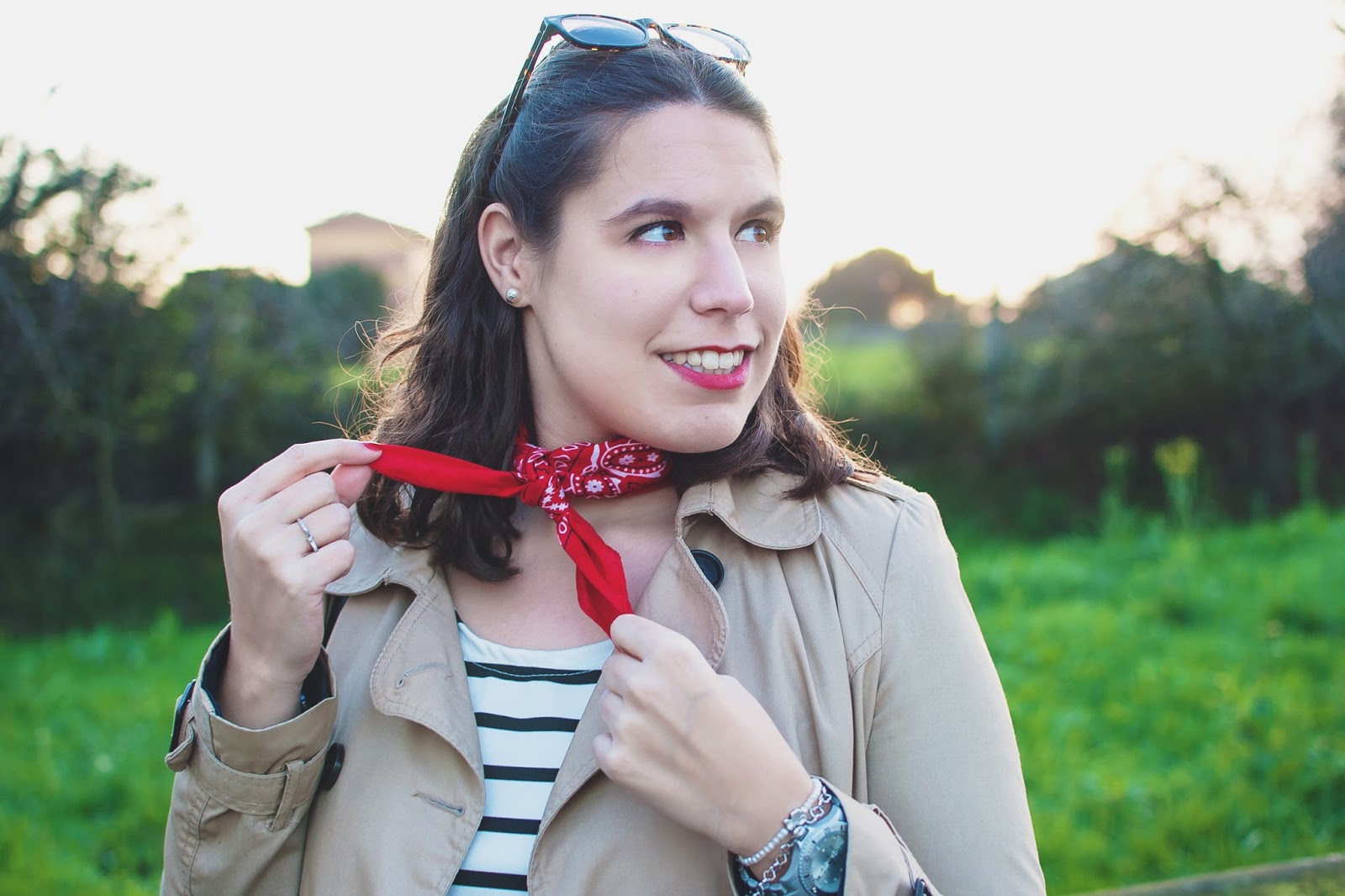 Desde que vi el combo de bandana al cuello + camiseta de rayas, no he parado de pensar en él. ¡No me puede gustar más! Me parece súper chic, perfecto para el día a día. Y acompañado de unos labios rojos, es un outfit para triunfar. Espero que os guste tanto como a mí 🙂