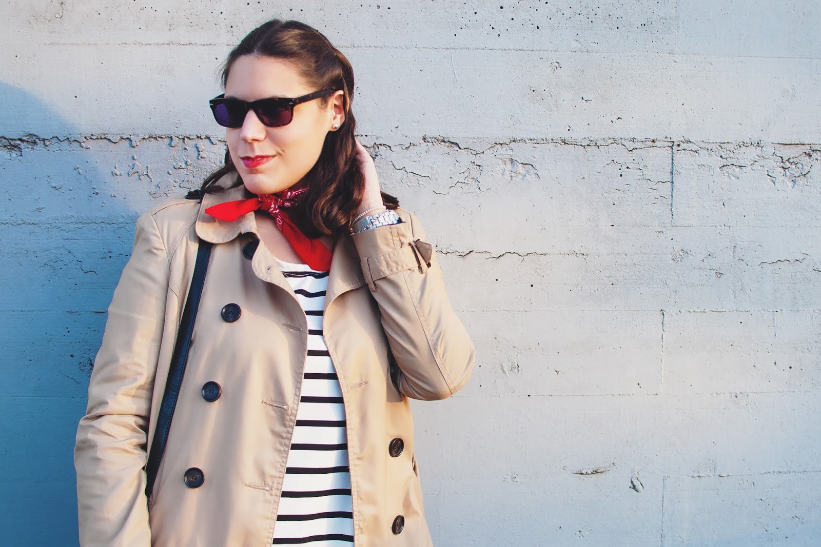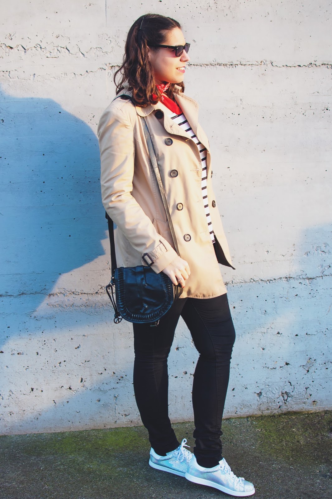 Me encanta el combo de la badana con la camiseta de rayas y el trench. Estás super guapa con este look
