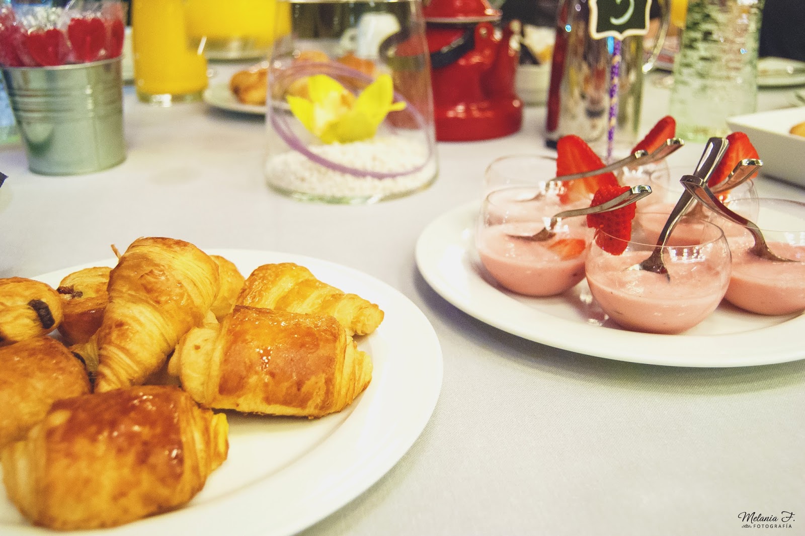 En la mesa nos encontramos con una bolsita personalizada con nuestro nombre y el nombre de nuestro blog, y otra más grande en nuestra silla, cargadas de regalos, muestras e información acerca de todas las empresas, que no tardé ni un segundo en cotillear. La merienda estuvo muy bien, ya que tenía un montón de cosas ricas: bollería, café, zumo de naranja, batido de fresa, chuches, caramelos, piruletas… ¡Además cada poco nos iban reponiendo todo!